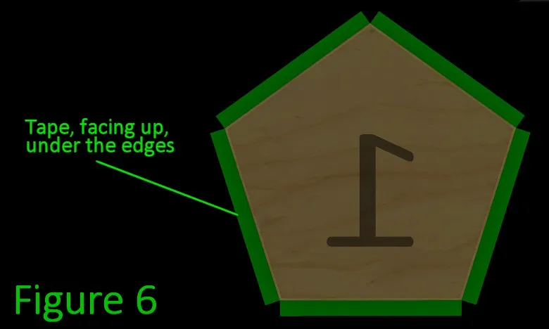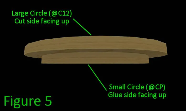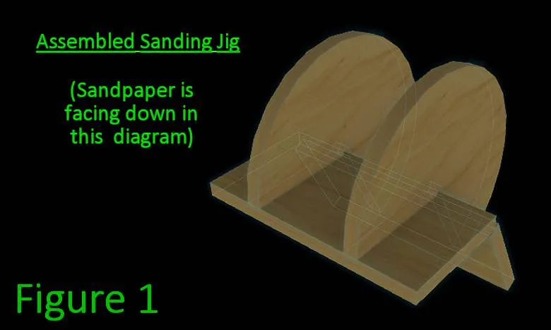 ** If you already have this from a previous project (or have a method of getting the correct angle listed in notes at top) then you can skip to Step 4 ** Remove any protective films from the 4 Sanding Jig parts (2x @JC + 2x @JR). [1] [2] ** Place one rectangular @JR piece on the edge of your table, grooves facing up. ** Place a semicircle @JC piece into each groove at 90 deg, and apply acrylic glue (using capillary method). Repeat for the other flat piece. The flat pieces will overlap a bit in the center, this is expected. See Figure 1 below for what it should look like. ** Jig should be stiff enough to use after all other parts are cut and shaped. If the glued joints are still flexible, wait up to an additional hour. ** place a piece of sandpaper on the open face of the @JR part that rests a bit under the other.