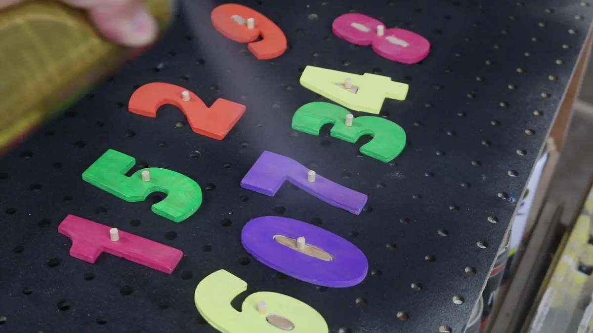 Maybe add some holes to the numbers so you can just glue the dowel handles straight in there.