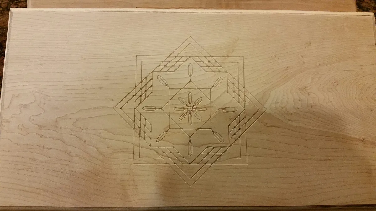 Through scanning an image and converting to a vector to loading into easel and creating the finished product. Used to decorate the top of a box for my quilting wife.