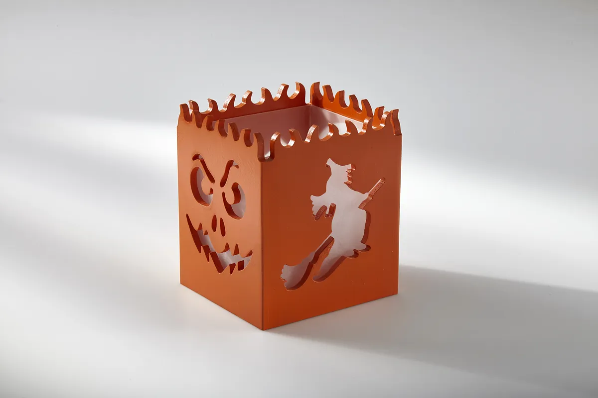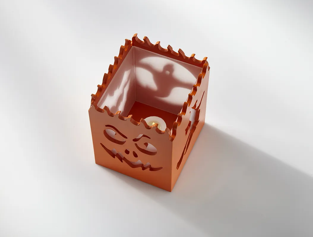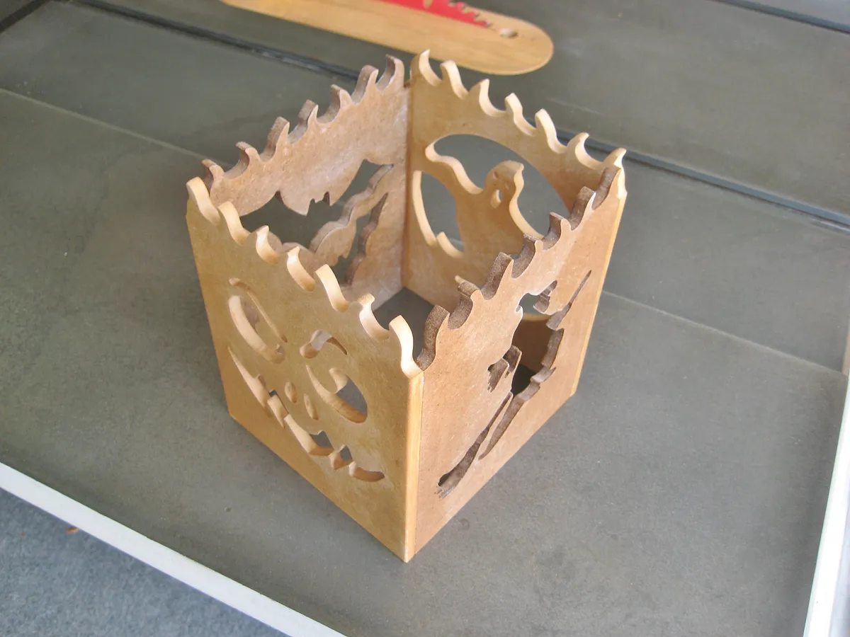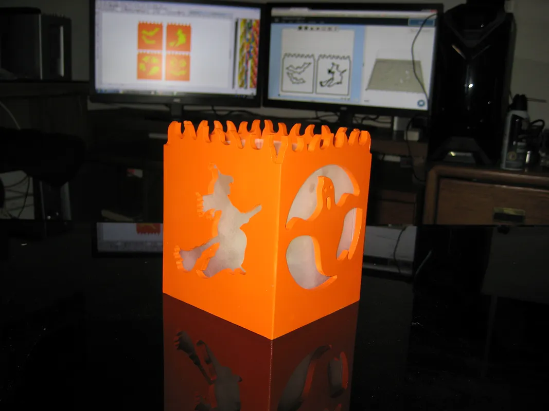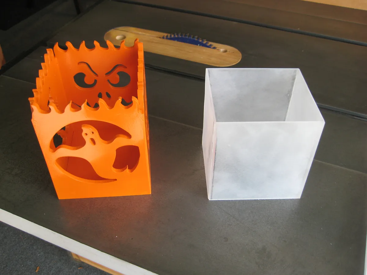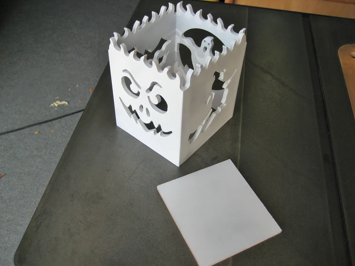 Great project. Made some tiny changes: younger son changed some of the silhouettes, added in a groove close to the bottom to hold the base. Used cellophane as windows. Added text to the base with kids name. Added holes for carrying handle. Son now painting outside. Trick or treat sweety box.