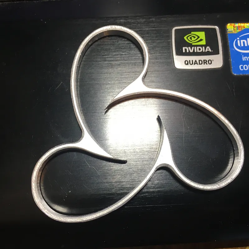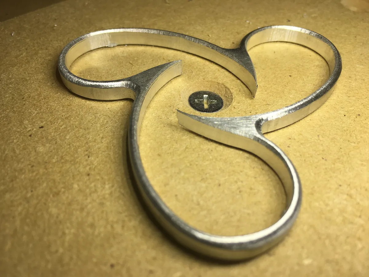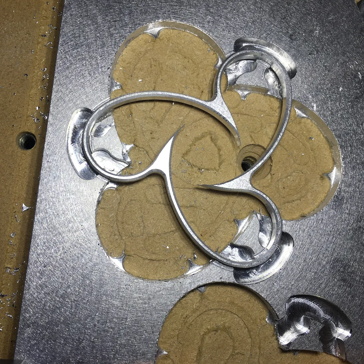I used 3/16" aluminum, but you can use 1/4". Mill the inner and outer contours with a 1/4" flat end mill. I used the 2F HSS upcut from Onsrud. Cut a small chamfer on the inner edge. Cut the 3D fillet profile on the outer edge with a ball end mill.