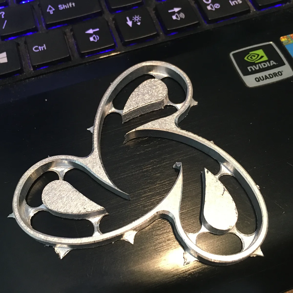 To do the backside mill a pocket in the waste material to serve as a holding jig. Do a cleanup pass around the edge to remove the tabs. Cut a small chamfer on the inner edge. Route the 3D fillet profile on the outer edge. This removes the burr and makes the edge smooth.