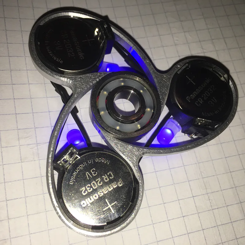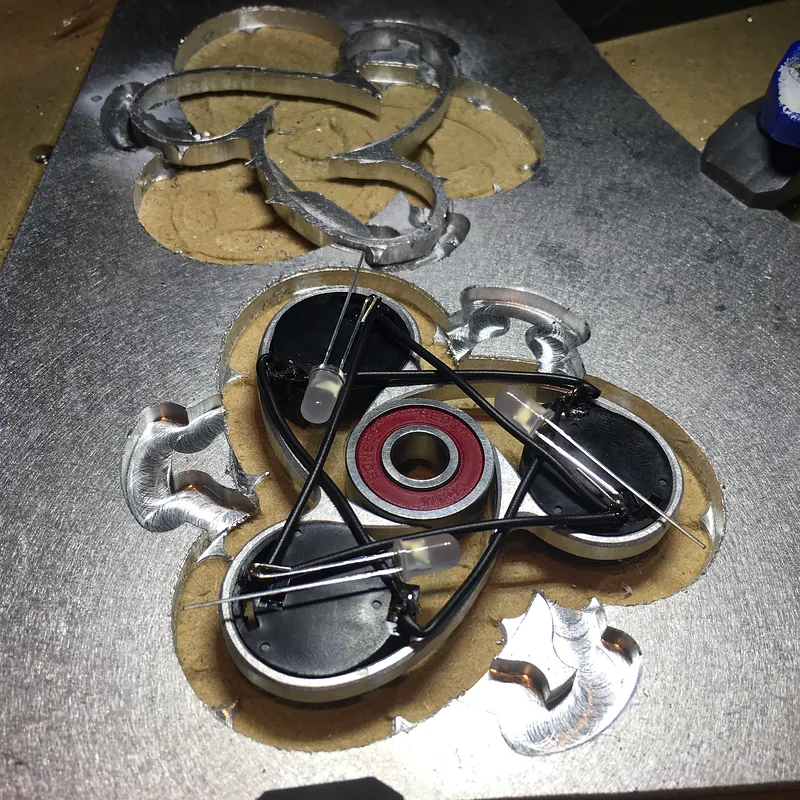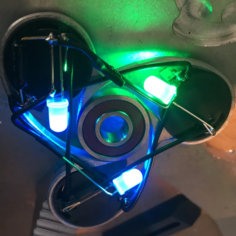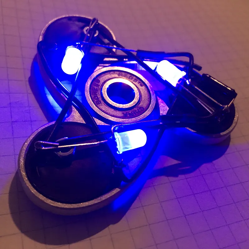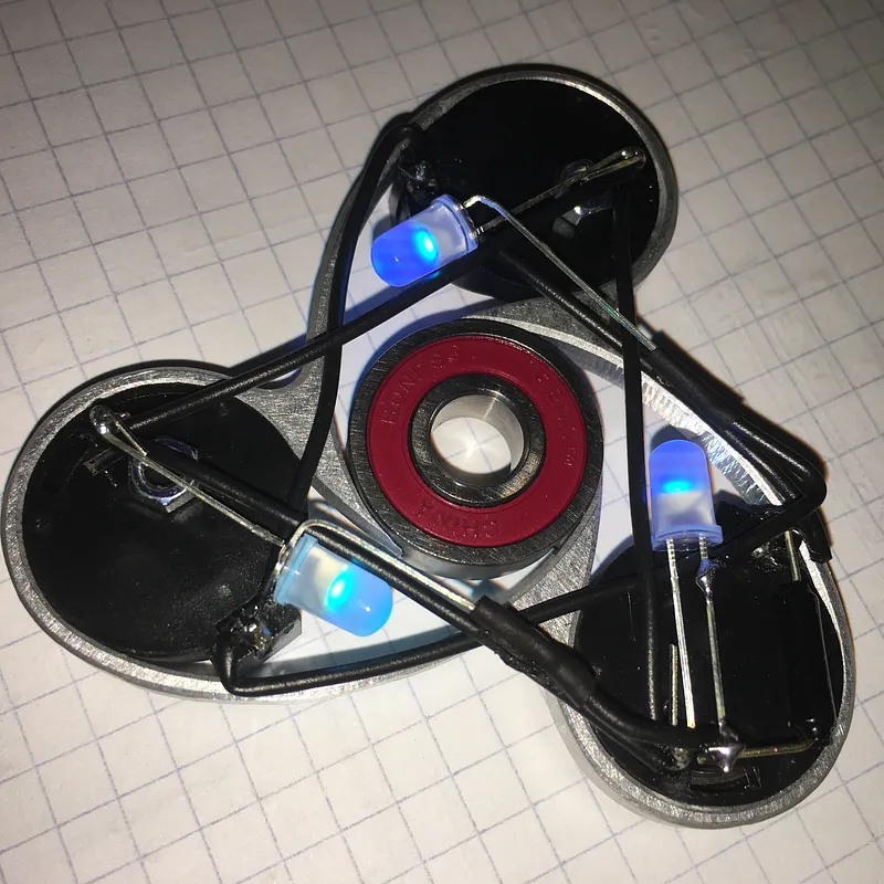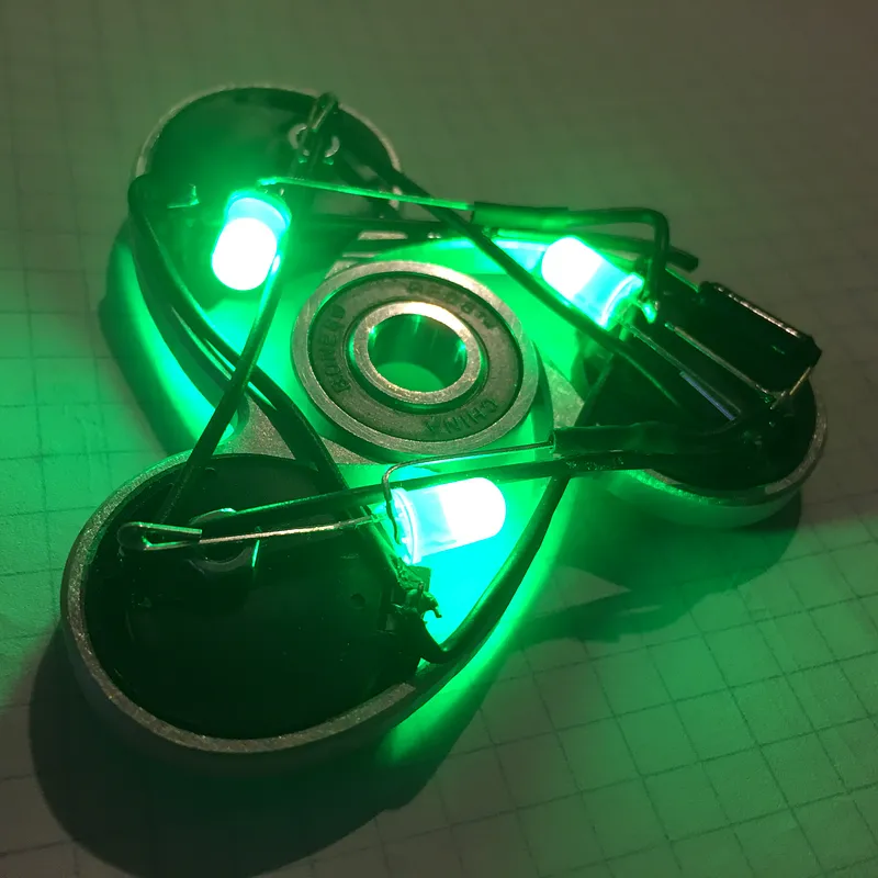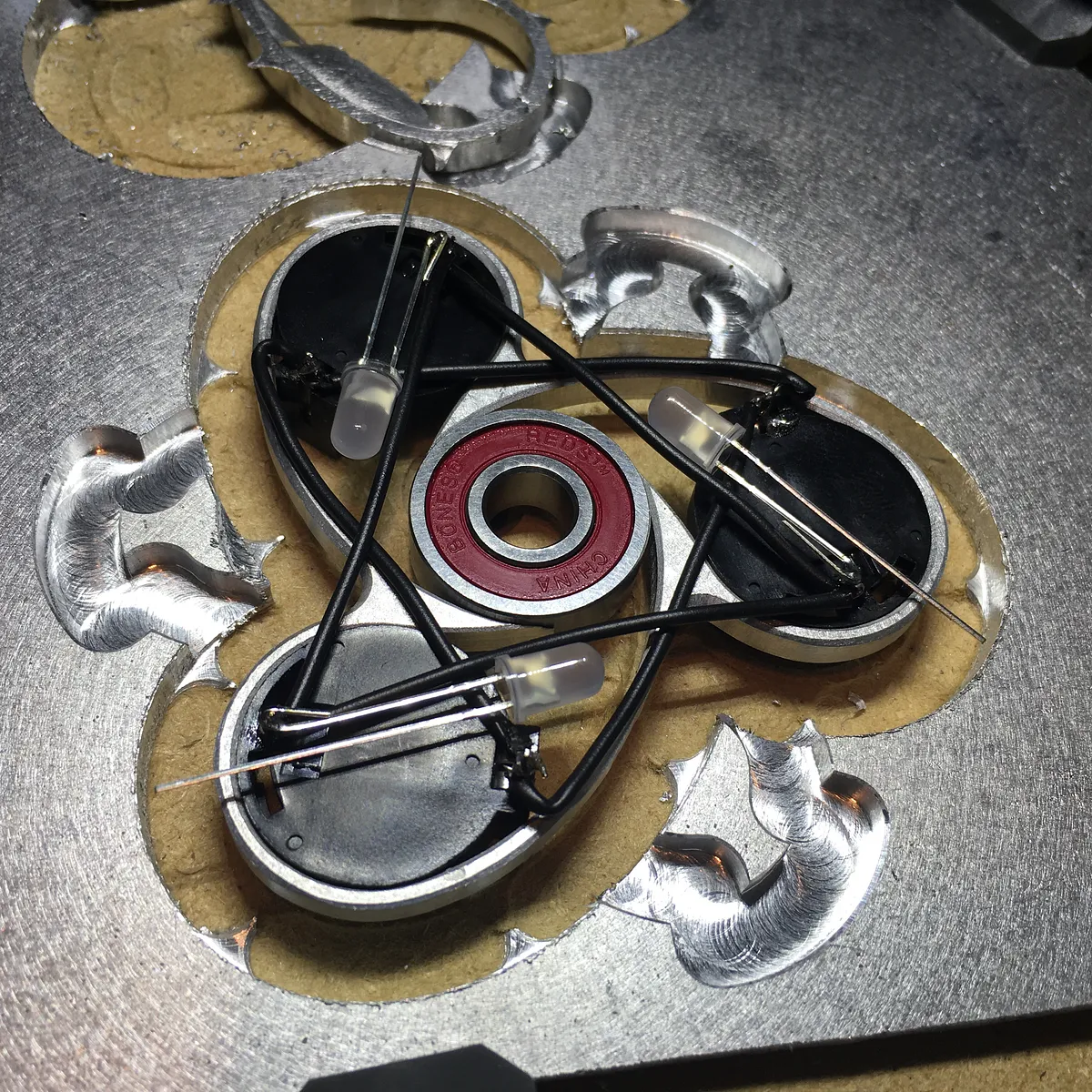 Install the button cell holders and bearing. Wire the positives and negatives in parallel. Solder the leds to the negative button cell lead. Put the tilt switch from positive to the led positives (I soldered it at a slight angle off horizontal, biased towards off). Spin!