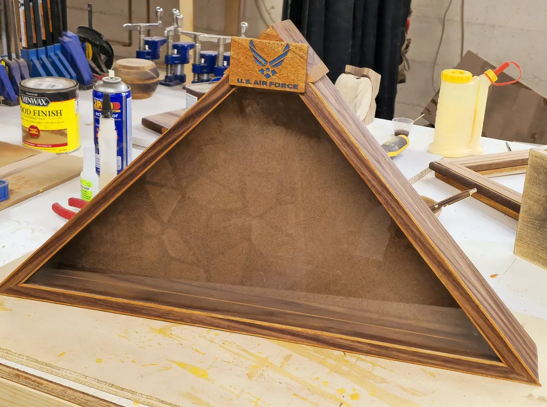 Small Airforce logo. filled with epoxy and placed on a flag display case.