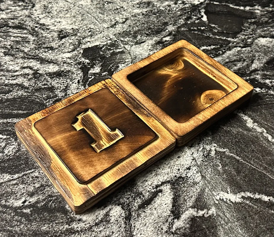 Made with 3/4 Birch Ply. I didn't include any carvings letters/numbers. Adjust depths for your project. I was searching for one and when I couldn't find one, I made a simple design. I used 1/8 down-cut 2f bit. I used the recommended cut settings, but could have used a faster cut rate.