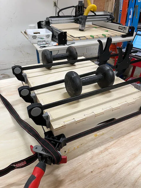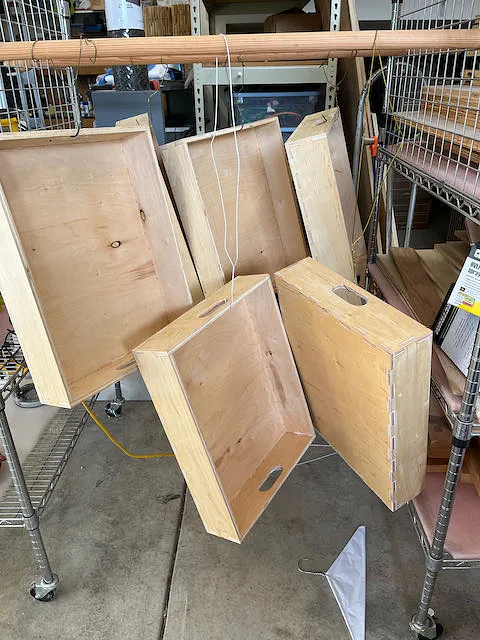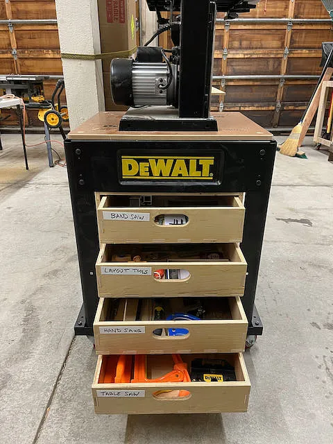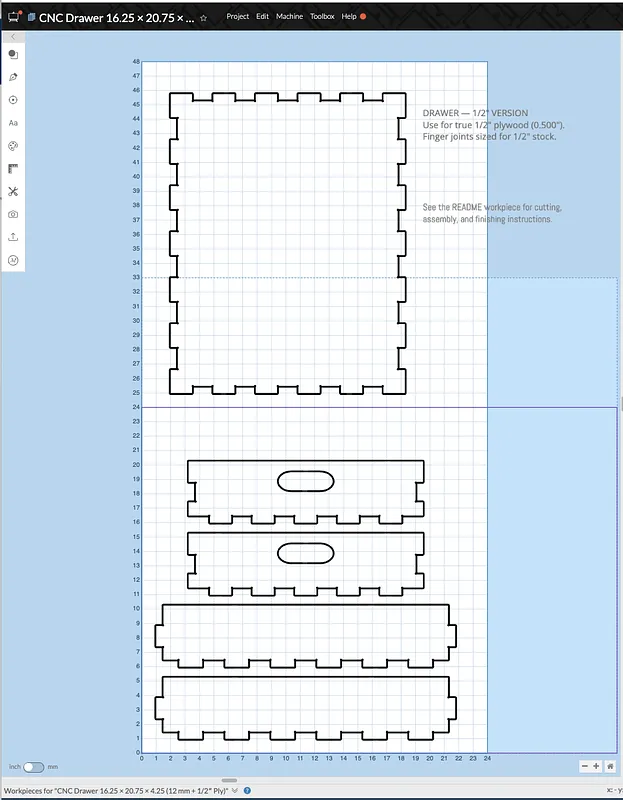 CNC-cut finger-jointed drawers sized for the DeWalt planer stand. Exterior dimensions 16.25″ × 20.75″ × 4.25″. Includes 12 mm and ½″ plywood versions. One sheet yields four drawers. Perfect for shop storage or custom cabinets.