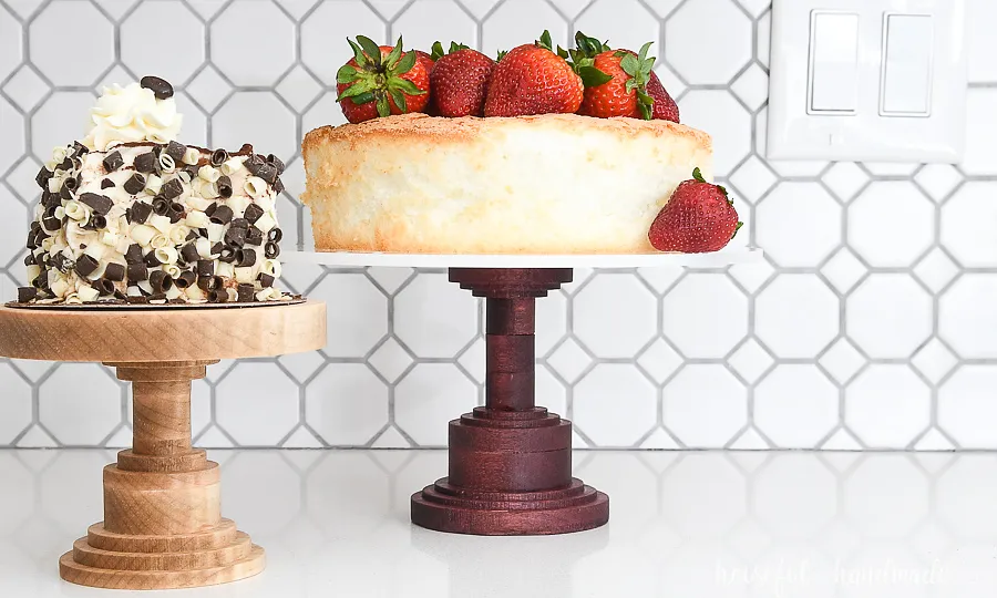 I detailed how to make both cake stands (including links to both Easel files) in this blog post: https://housefulofhandmade.com/diy-wood-cake-stand/.