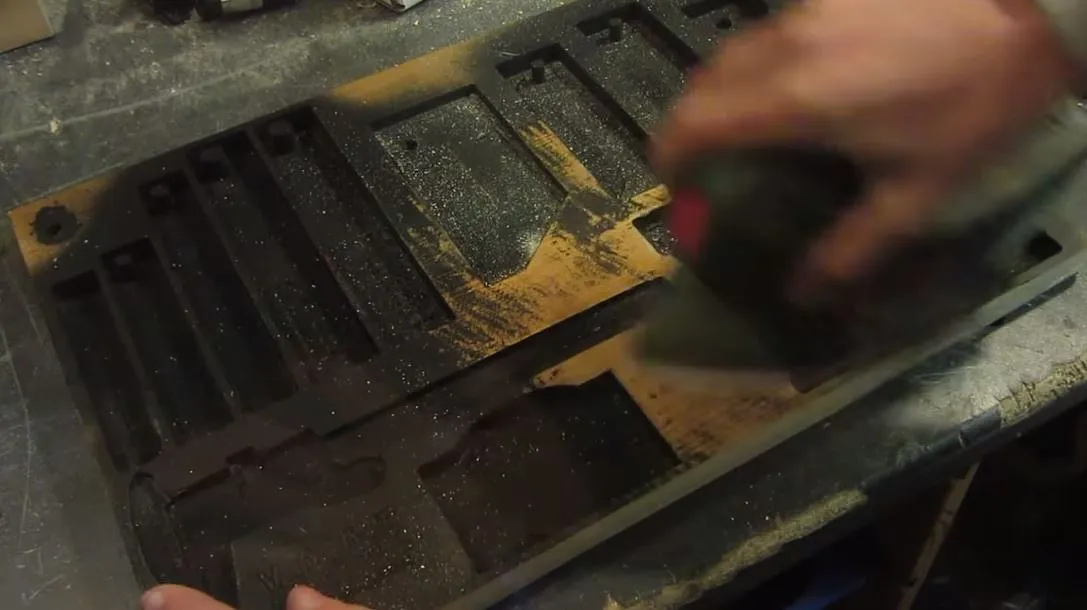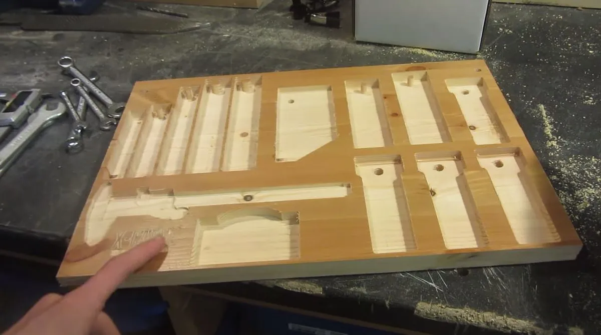 If you want you can paint your tool rack, I opted for black and then sanded the surface back to the wood grain to reveal a cool contrast in the carved areas