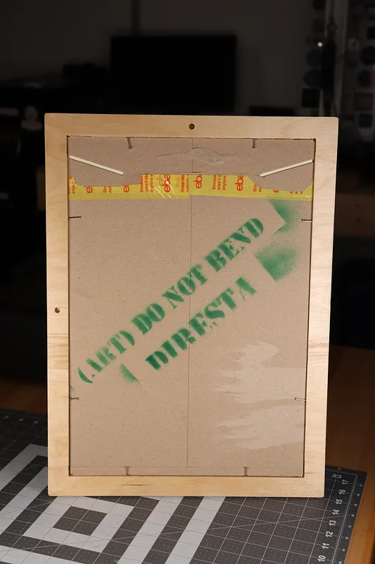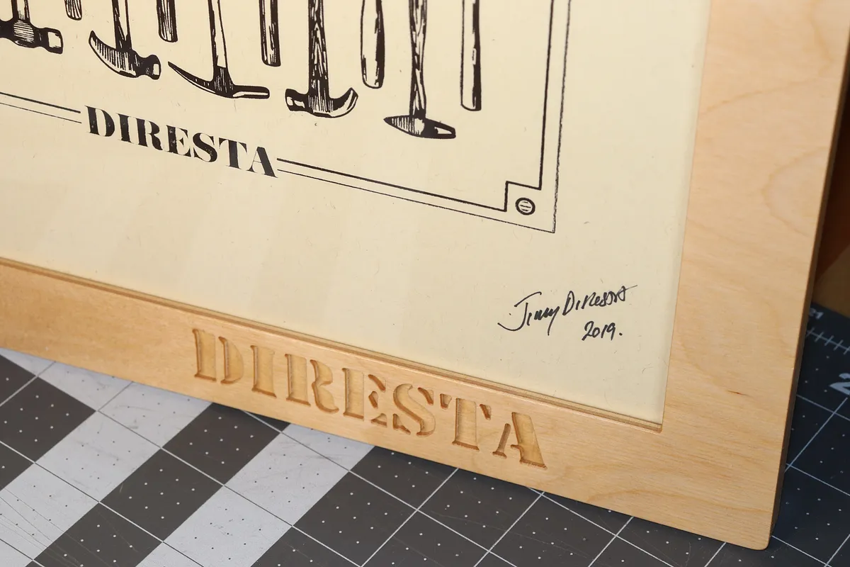 You'll need to secure a piece of Burch plywood to the X-Carve. The frame will hold a 12x17 picture or print. The total frame size is 14x19. You'll need a 1/8 and 1/16 endmill. This frame portion of this project uses the center and top of the material as the home position. The stock material will need to be at least 15x20 inches in size. Place the clamps as close to the edge as possible to avoid interference with the cut. Tabs are used to prevent the interior and exterior material from moving during the cut. Once the initial frame is cut out you'll need to flip it to the front and re-secure it. For the "Diresta" cut, mark out a 1x5 inch location. The home position for this cut will be the top surface and the lower left corner. I secured the lens, print and backer with some small stainless nails installed into holes I drilled into the rabbit of the frame. I finished the wood with a clear spray lacquer which I use often because I can get several coats done in a short amount of time. The spray liqueur dries very quickly. It also helps if it's a warn, sunny day. For an extra nice finish, do a very light sanding between coats, remove the sanding residue and give the coats extra time to cure.