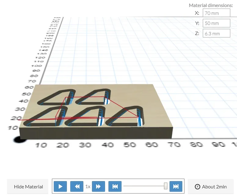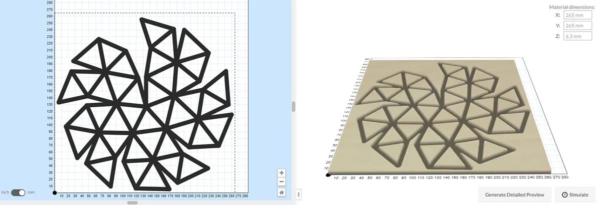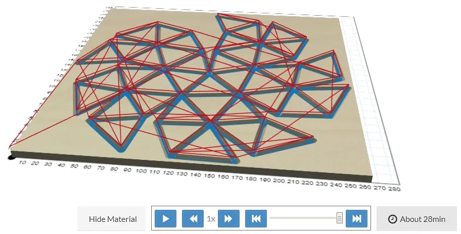 Using the pieces from the previous step, put together a flattened carving layout for the X-Carve. There will be many gaps that would require gluing after the carving, but it's unavoidable with any mitered 3D object. Using any 1/4" thick plywood, leave about 1 mm of material uncut so that the piece stays together and require less gluing. Select the 60 degree V-groove bit for the cut.