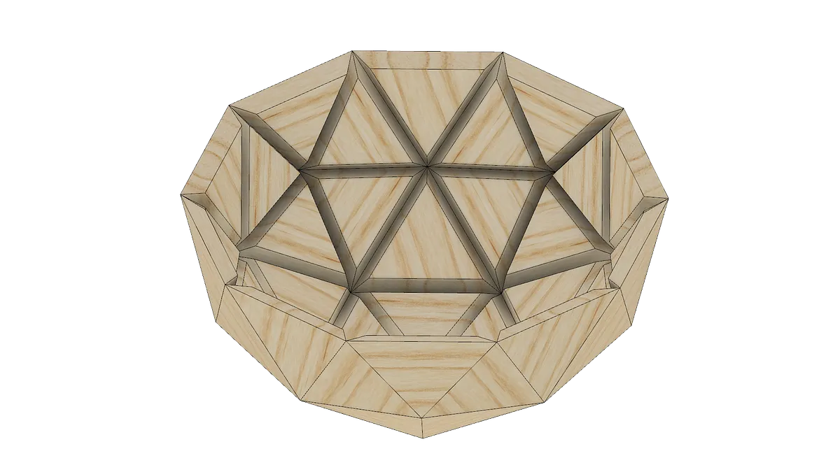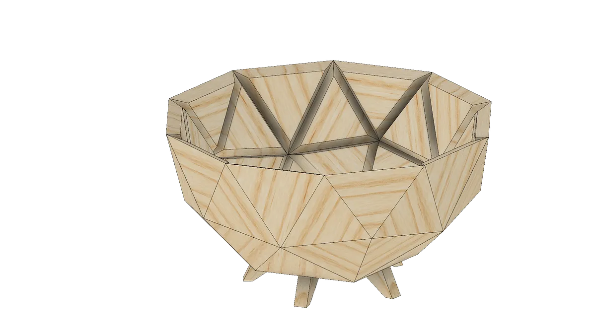Use a geodesic dome calculator to generate the dimensions for the triangles to match the diameter you are aiming for. I chose a "2v"-style geodesic dome as it consists of only 2 different triangle sizes and has a flat base. My Easel cuts are for a 16 cm diameter bowl, but it could be scaled to match your needs.