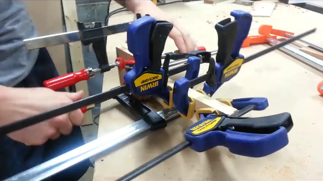 Quickly add clamps to your glued mallet, the more clamps the better! Check the surfaces when tightening clamps to ensure things are staying even and flush.