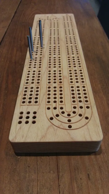 Cribbage board holes are 1/8 inch nominal to fit tapered pegs. While Easel does not support drilling operations, it does support importing g-code.