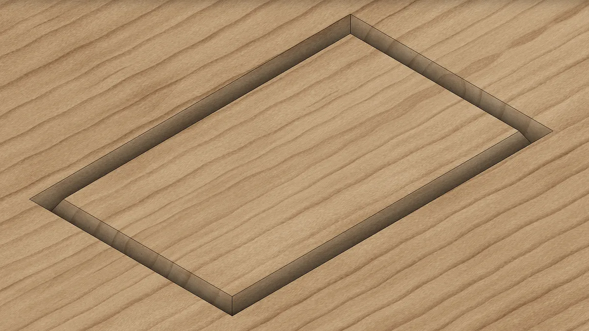 The first cut we will make creates the chamfer of the cover. This will be done using the 1/4" 60º V-Bit. It should pass through all but about 1/8" of wood, which will prevent it from being removed until the next step. Once the cut is done, swap the bit for a 1/8" standard wood bit.
