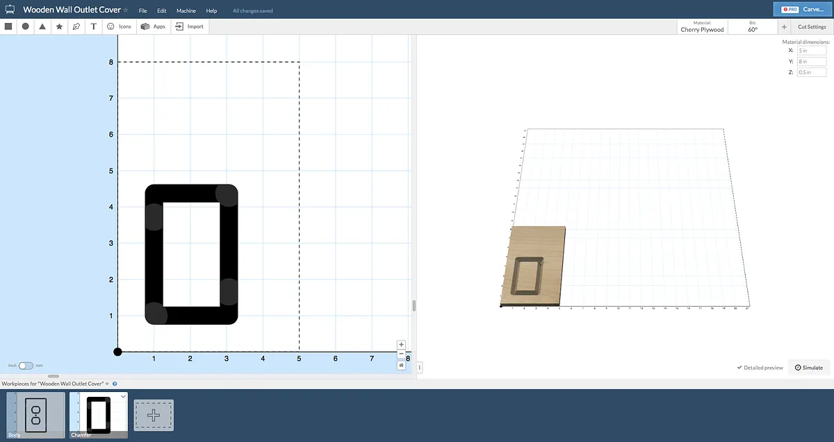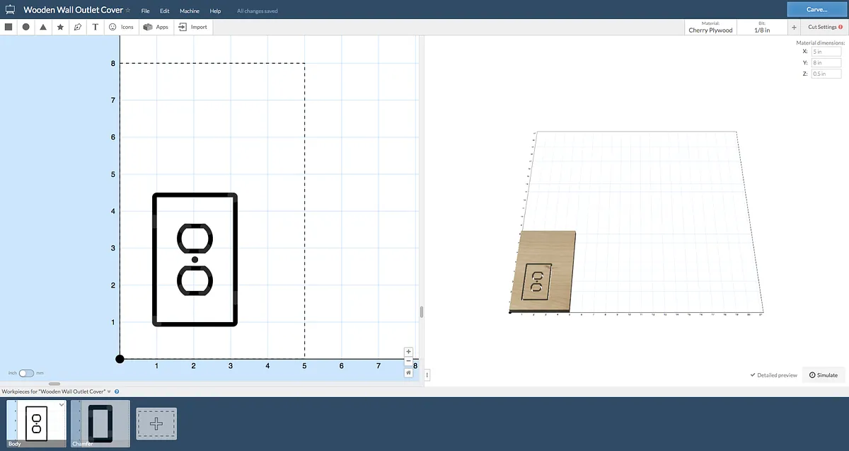 This second (and last) cut we will make cuts the socket outlines, the screw hole, and at the end the perimeter. Be sure the bit is now 1/8" and it is beginning in the same position. This time, the perimeter cut should go all the way through the material