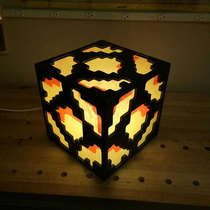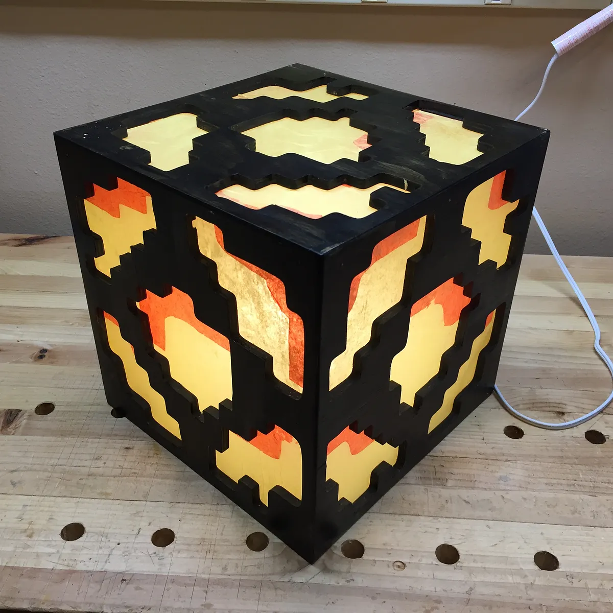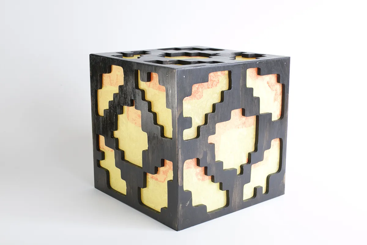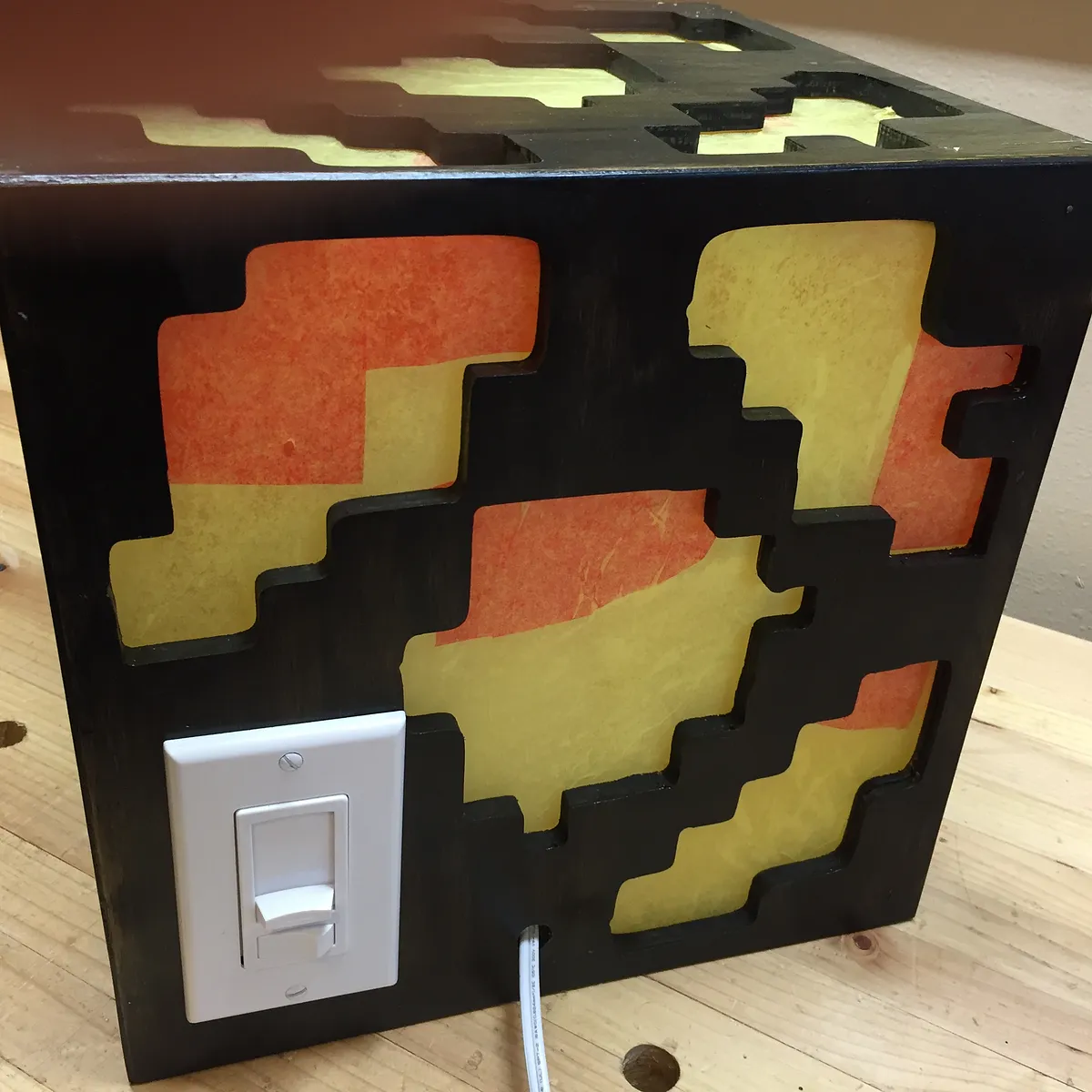 Glue five panels together to form a cube. (exclude the bottom panel, which will be fastened with screws) Use reinforcing wood blocks on interior to add rigidity to the cube sides. Cut five polycarbonate (lexan) windows. Glue red and then yellow tissue paper over exterior side of lexan windows.