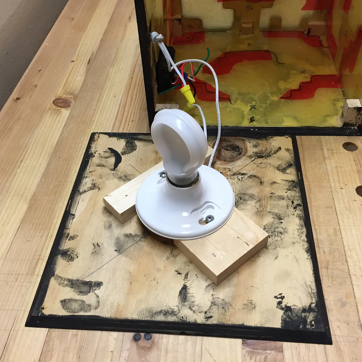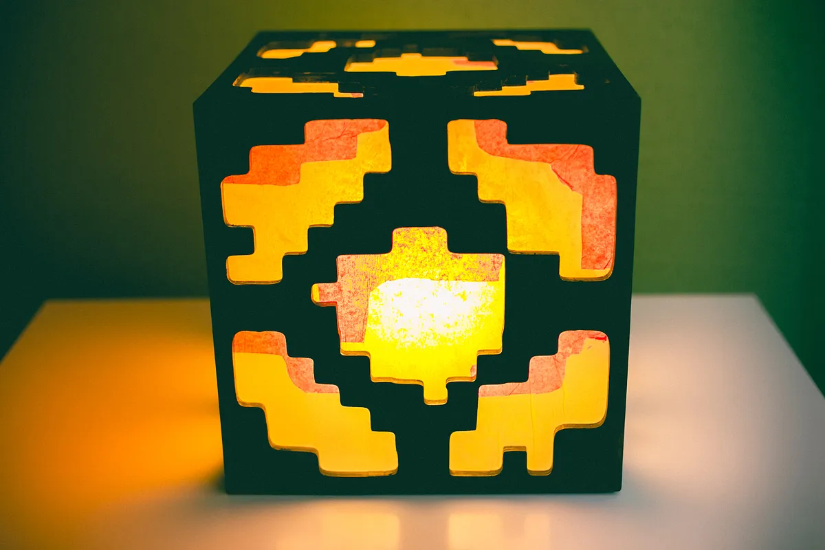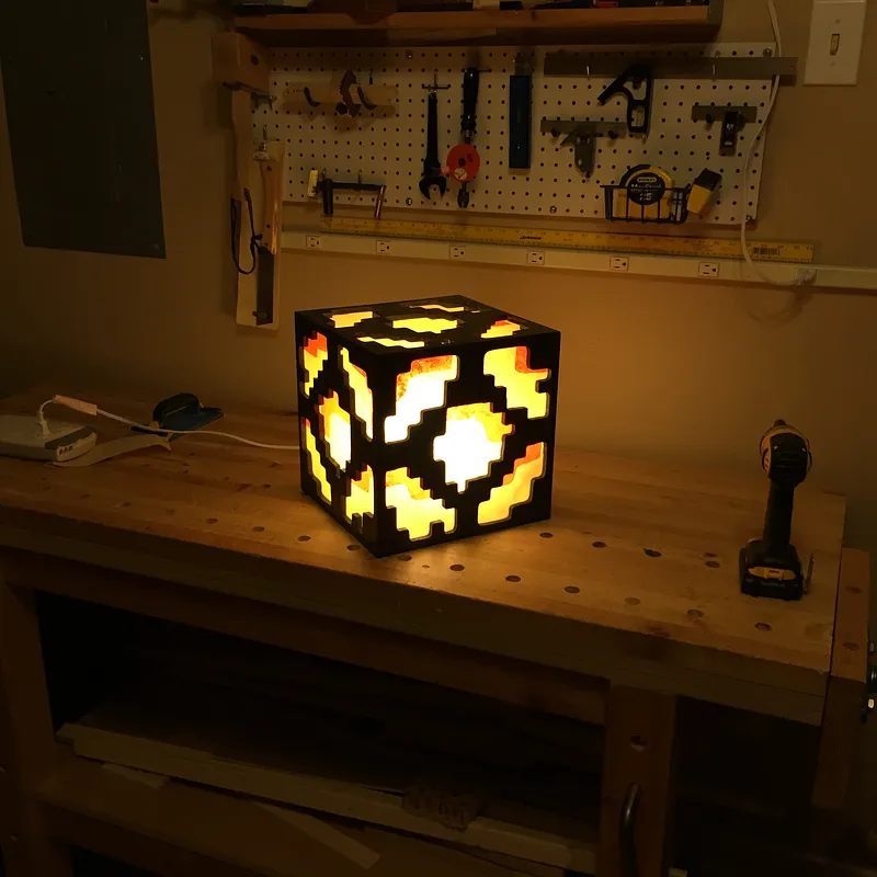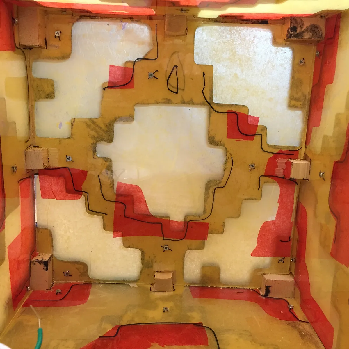 Glue five panels together to form a cube. (exclude the bottom panel, which will be fastened with screws) Use reinforcing wood blocks on interior to add rigidity to the cube sides. Cut five polycarbonate (lexan) windows. Glue red and then yellow tissue paper over exterior side of lexan windows.