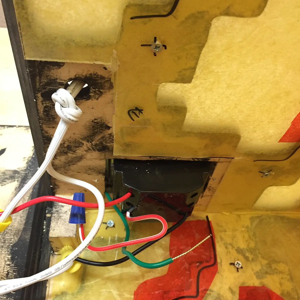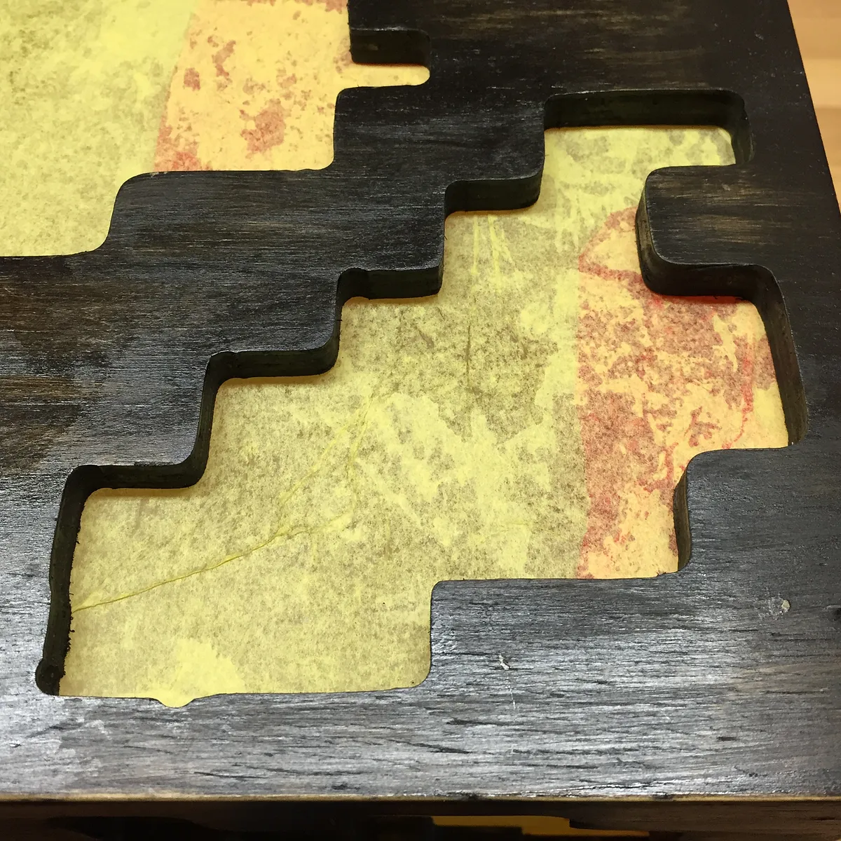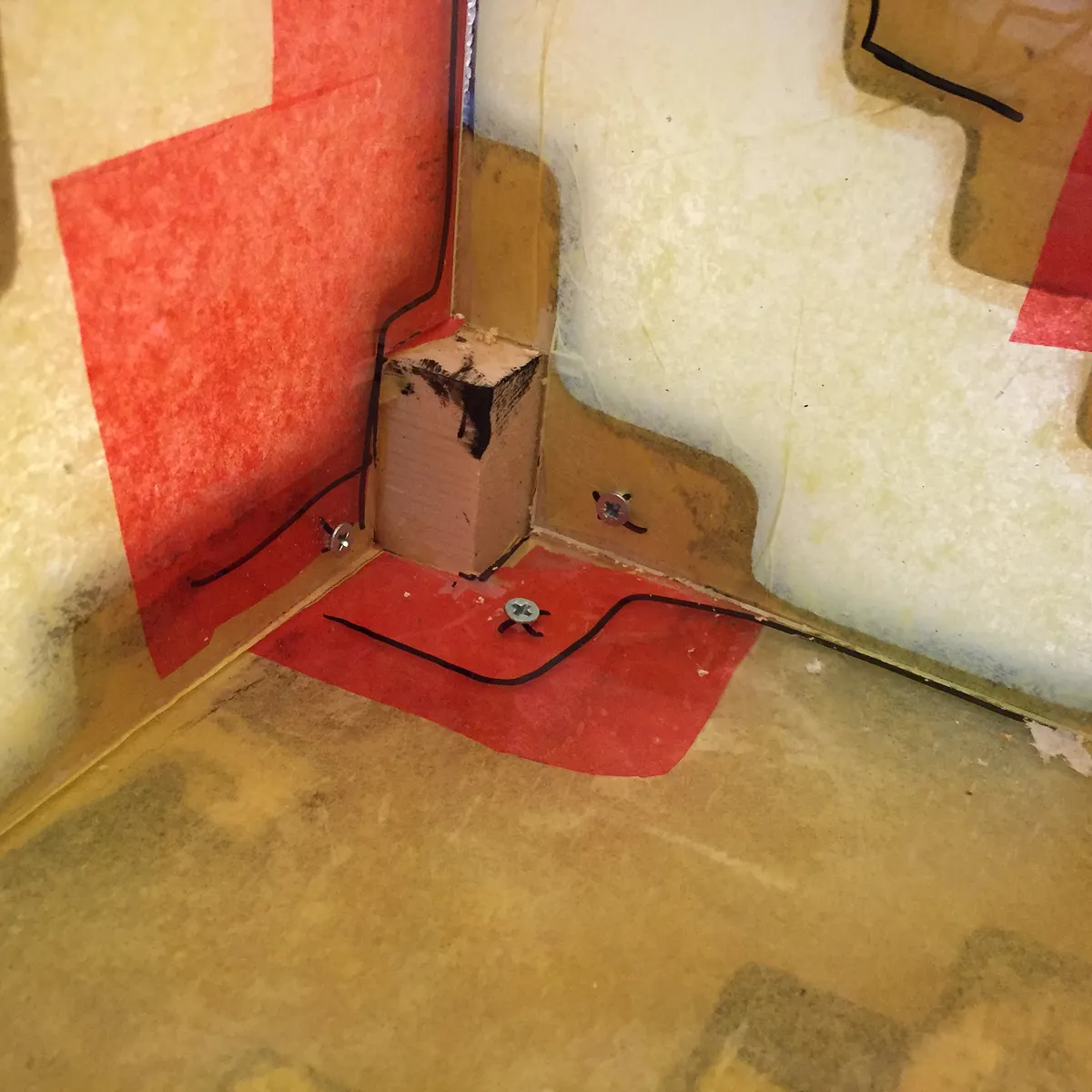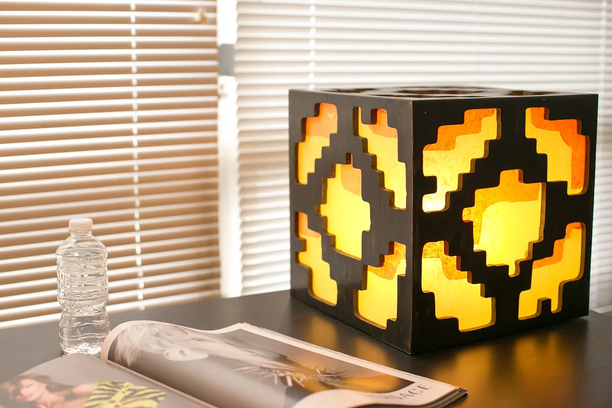 Glue five panels together to form a cube. (exclude the bottom panel, which will be fastened with screws) Use reinforcing wood blocks on interior to add rigidity to the cube sides. Cut five polycarbonate (lexan) windows. Glue red and then yellow tissue paper over exterior side of lexan windows.