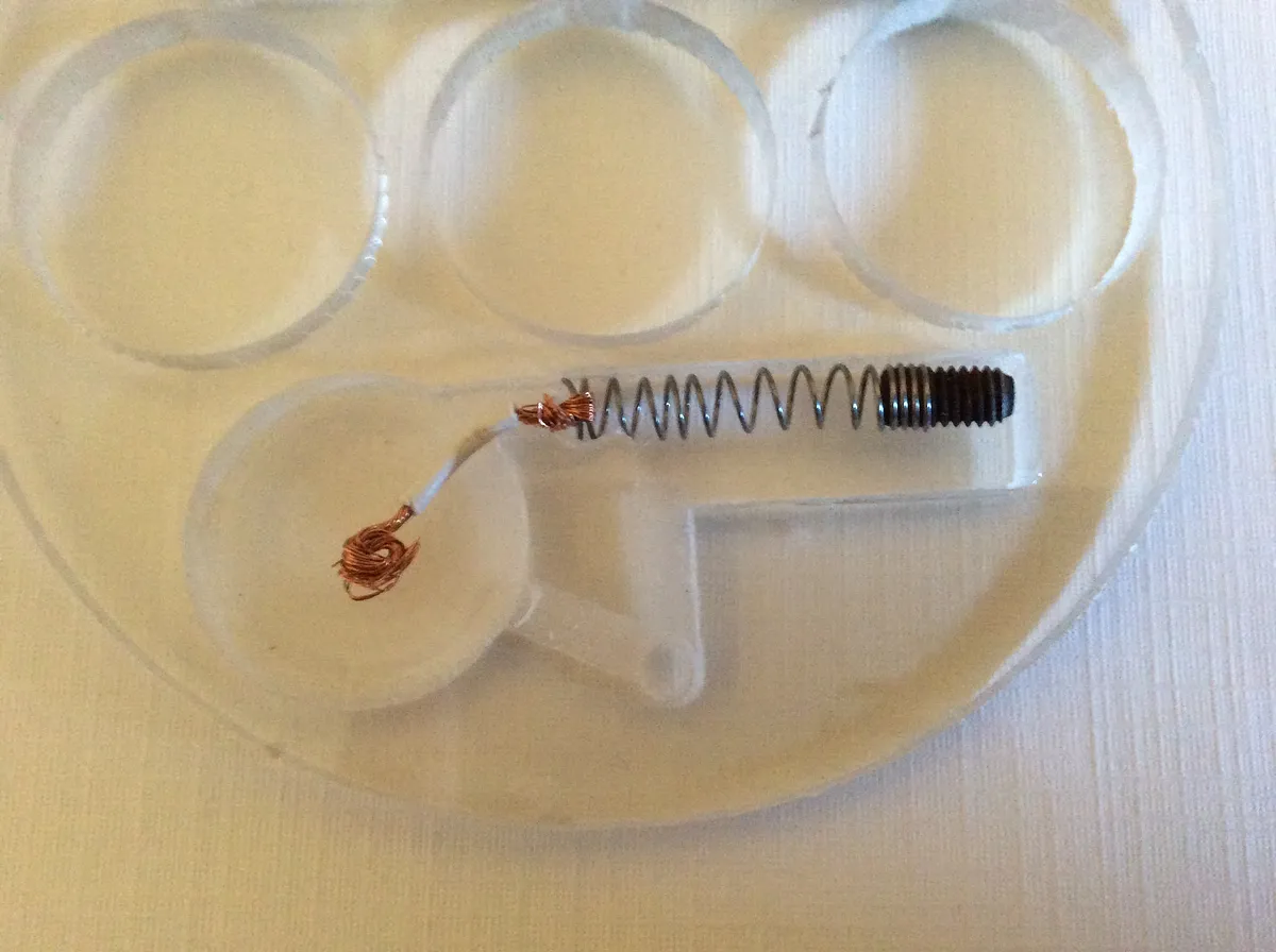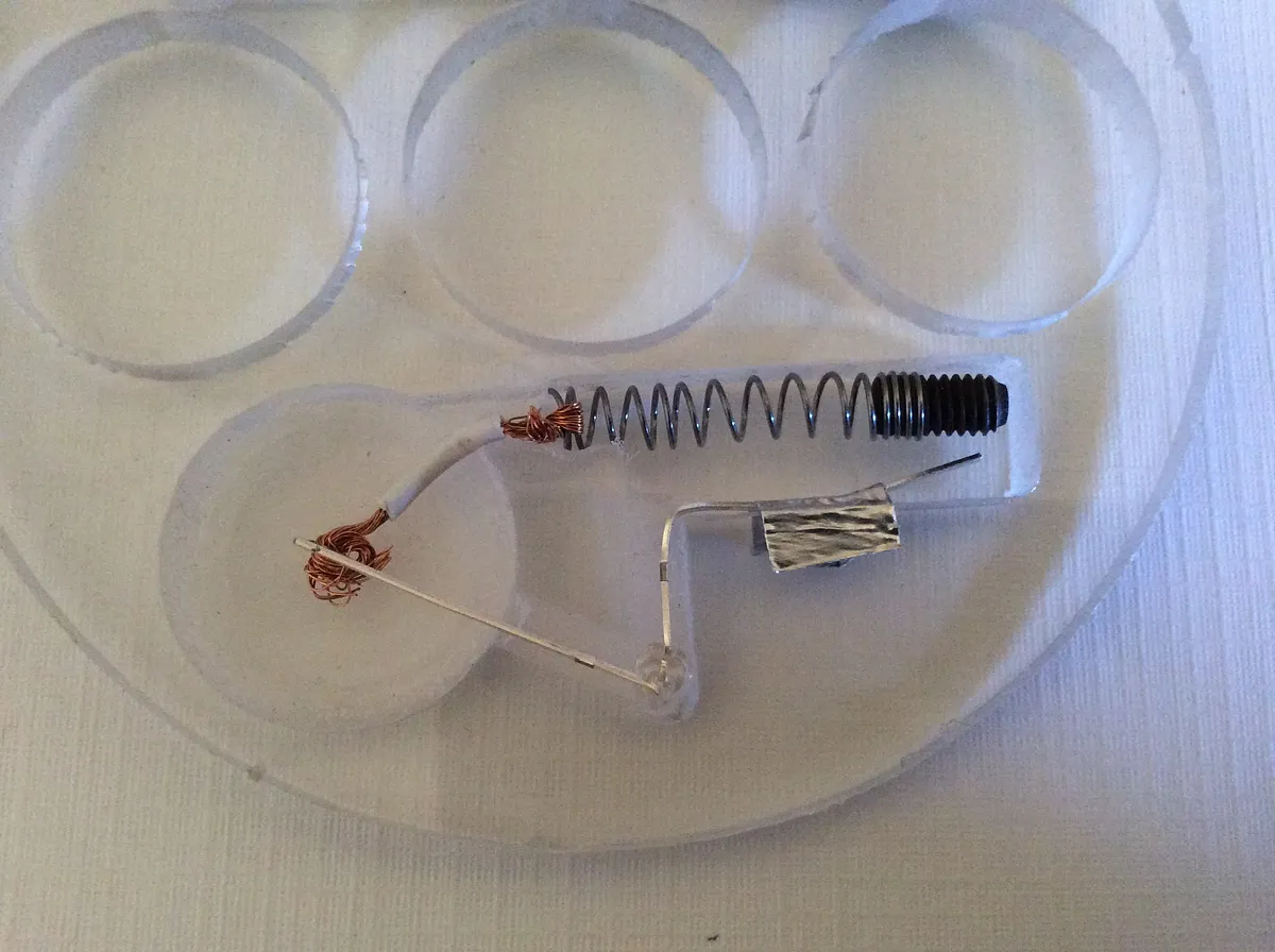 To make the spring for switch, remove a spring from an old ball point pen. Test fit the spring by pressing it in the small square extension to the rectangle opening, should be a tight fit. If not it can be wrapped with the foil tape later ( or adjust the design accordingly). Stretch the spring a bit to make it more flexible and cut it so it fits. Screw a set screw ( or screw with head cut off) into one end of the spring and test it again for length. The end should move freely.