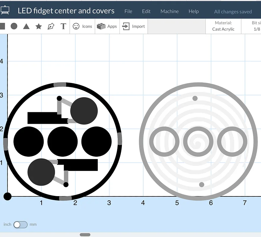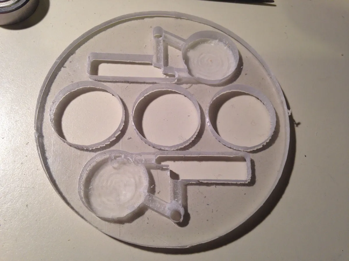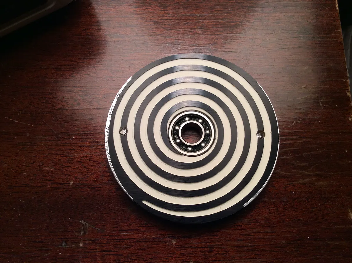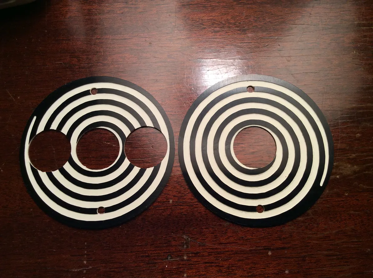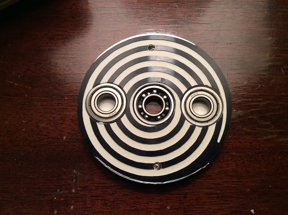 Cut center plate from acrylic using 1/8" two flute straight bit. Cut the covers from two color engraving plastic using 1/16" single flute upcut bit. Because the bearings were thicker than the center plate, I also cut opening in the back cover to accommodate them. If your acrylic is thicker you can skip the two outer bearing holes.