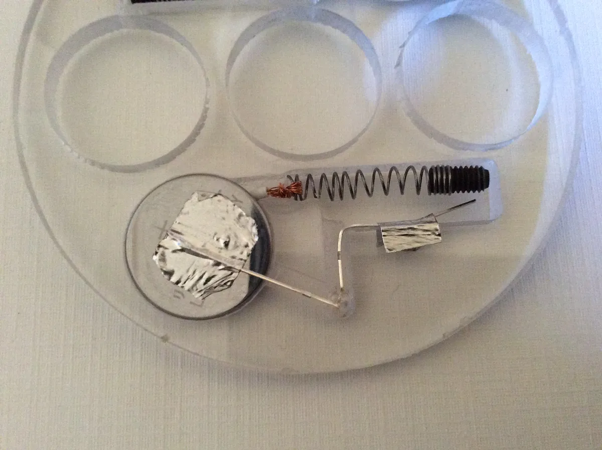 Wire the switch by taking a short piece of wire, strip a short section at one end and slip it between a couple of loops on the spring. Twist the wire to secure it. At the other end of the wire, strip a longer section and create a ball. Wire should be long enough for the ball to reach the center of the circle cut for the battery.