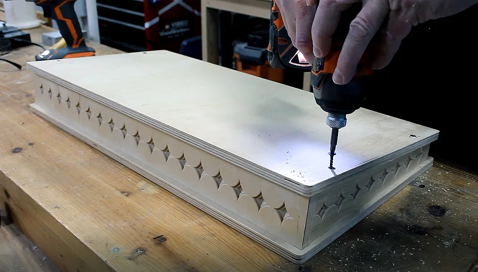 Cut the leftover piece of plywood to 23.5" long. This will result in the top and bottom boards having a nice overhang around the sides. I wanted to continue the diamond pattern across the front of the pedal board. If you changed the pattern on the sides, you might want to change it on the front as well so it matches. If you decide to remove the design, then you just need to cut the panels to fit.