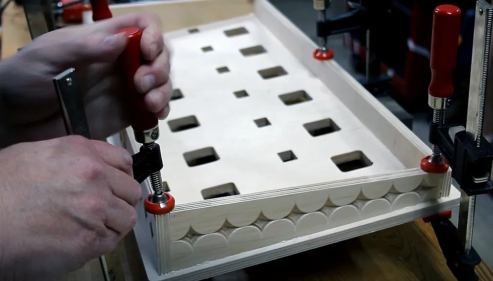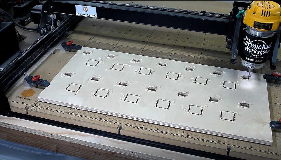 Pick out your best looking board for the top. Double-check the thickness of the plywood to make sure the setting is correct in Easel, then mount it on the X-Carve. I like to put a piece of 1/8" hardboard underneath when carving through holes, so I don't cut into the pretty waste board. Carve the holes into the top, remove tabs, and sand. At this point, the top and bottom boards are ready for assembly.