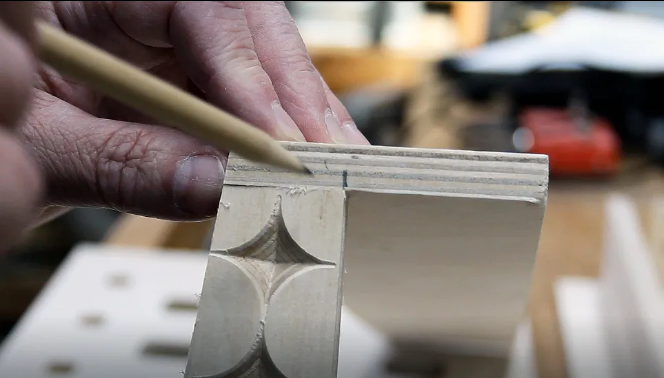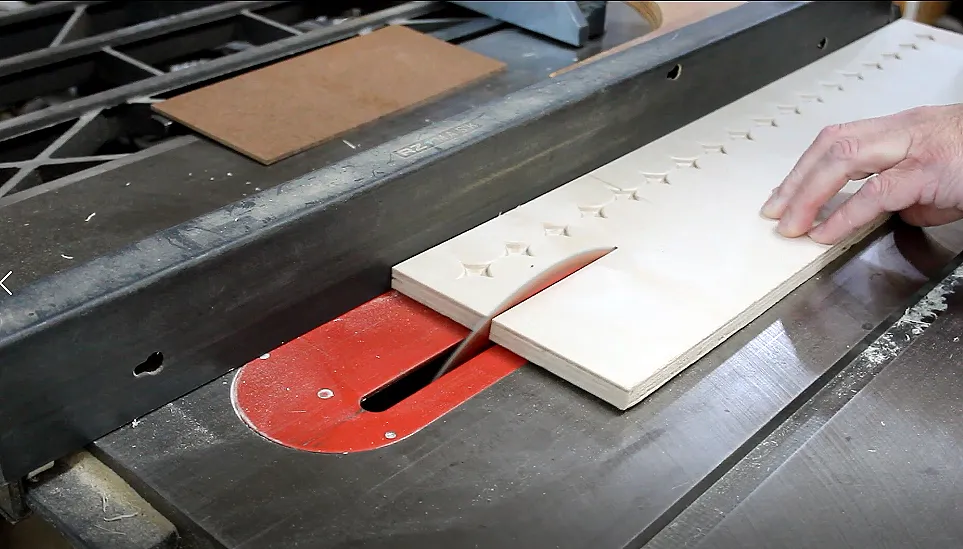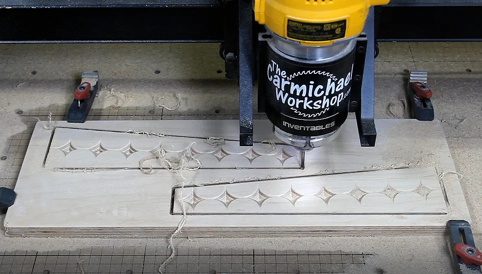 Position the side pieces on the workspace so that you will have enough plywood left over to make the Front and Back panels (about a 24"x6" board). Carve the diamond pattern with the v-bit first, then change bits to cut out the two sides. Remove tabs and sand.