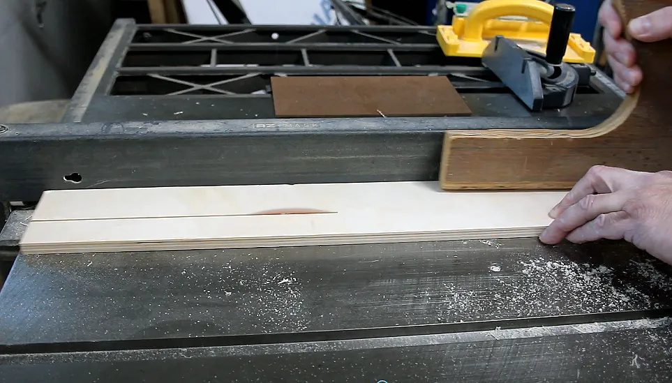 Use the 90 degree v-bit to carve the design, if applicable, then cut the front and back panels to size. Use the side pieces to mark where the panels need to be cut. The side pieces have a 7 degree angle, so I tilted my table saw blade to make the angled rip cut on the front and back panels. Sand the two panels.