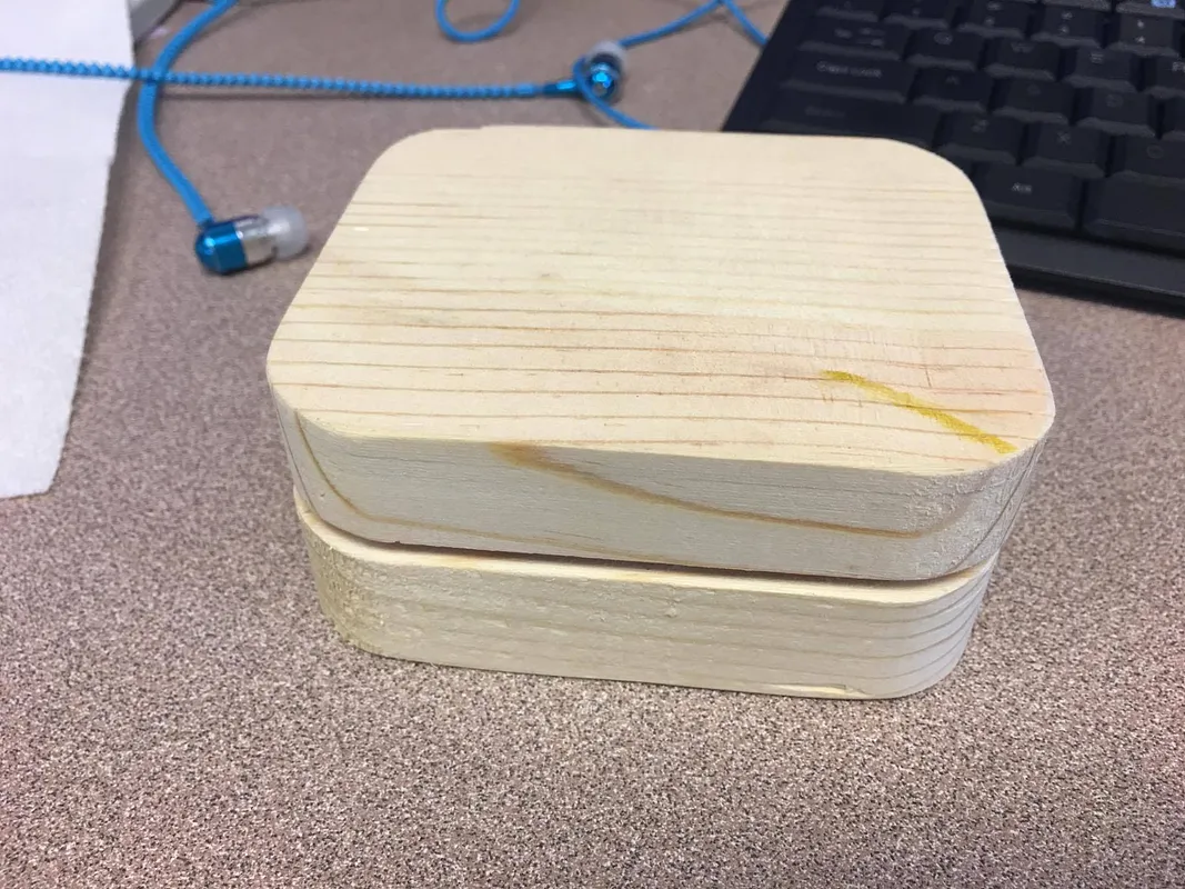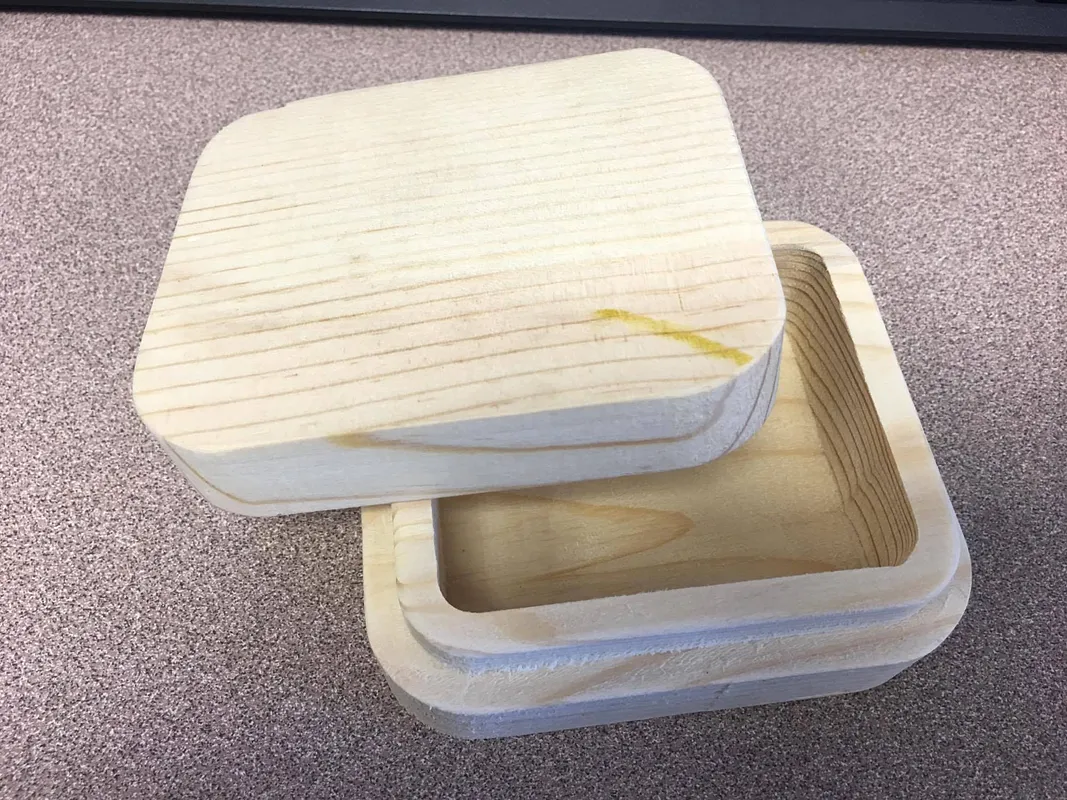 A box made from a 2x4 using a 1/4 router bit. Recommended: 1. set depth per pass to be 20% of over all thickness of the wood. 2. make sure you zero x and y at low as possible on the piece of wood.