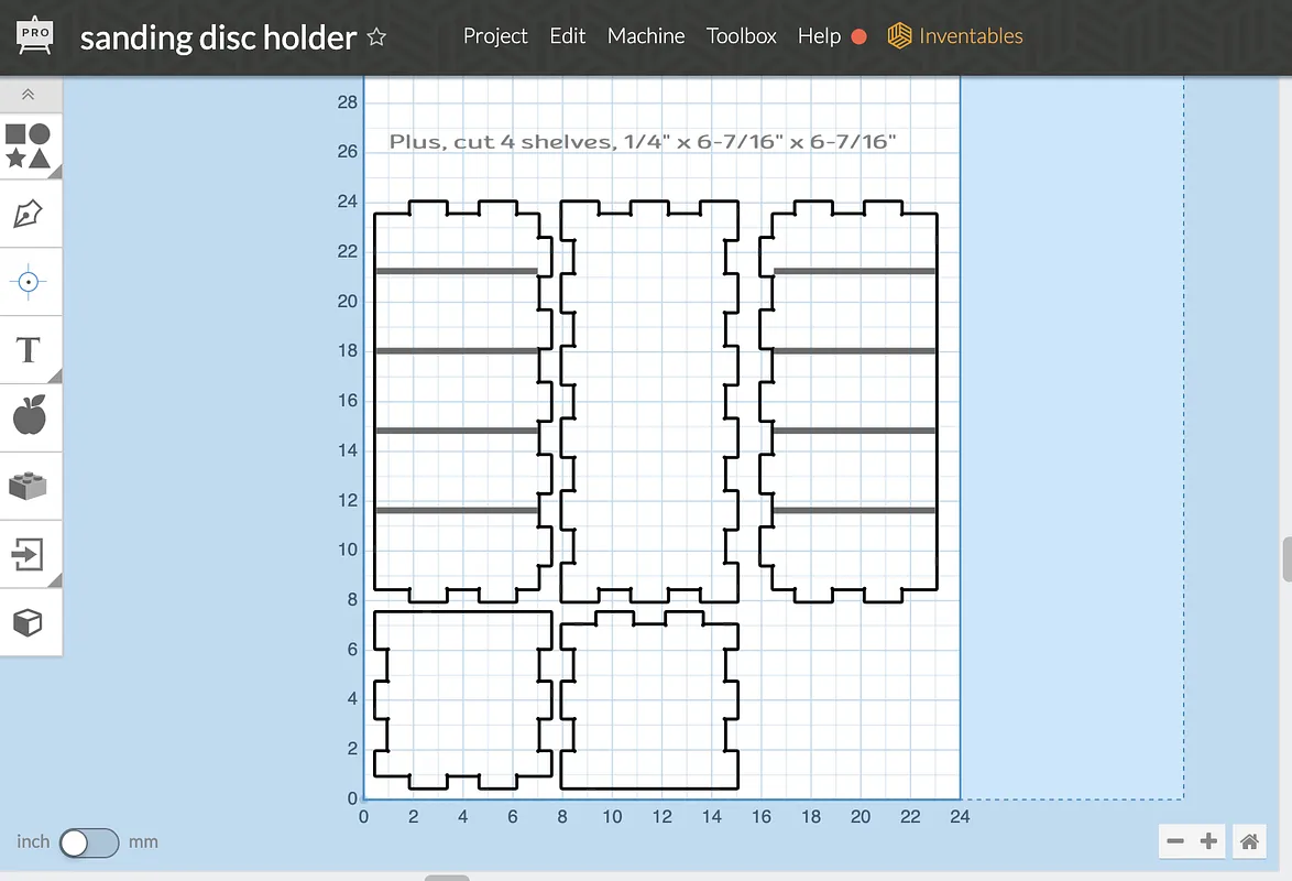 A compact CNC-cut organizer for 5" sanding discs. Made from either 1/2: MDF or 12mm plywood plus 3/16" shelves. Finger-jointed construction, strong and durable. Includes a README page, and a NOTICE about the Easel layering fix for proper shelf dado carving.