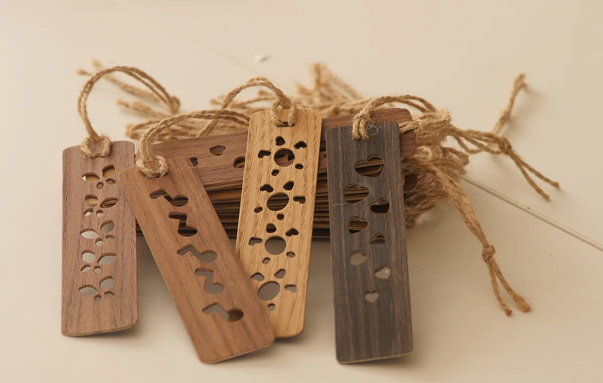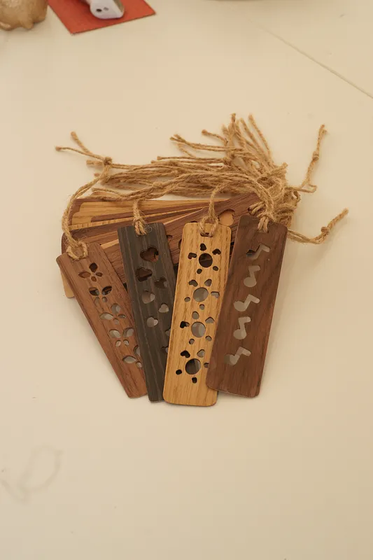 Bookmarks made by gluing 3 veneer layers; woods used are Wenge, Walnut, Ash, Birch. The 3-layer gluing with crossed grain provides necessary strength. Routing creates the design and side edges, then the final shape is done by hand.
