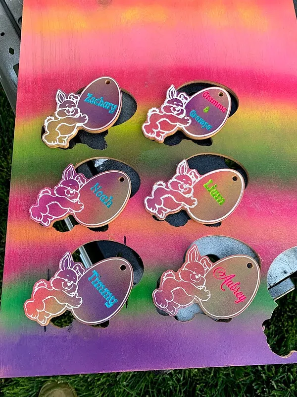 Fun way to personalize Easter Baskets... Spray some 1/2 Luan any fun colors - let dry n cut.