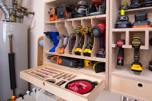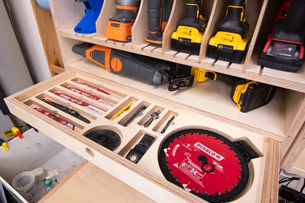 Digging around in a pile of sawzall, jigsaw and multitool blades was getting old. So I designed a small drawer in my tool storage cabinet to hold all of my blades! It has cut outs for different size blades and finger notches for easy removal. Check out the full video for cabinet build details.