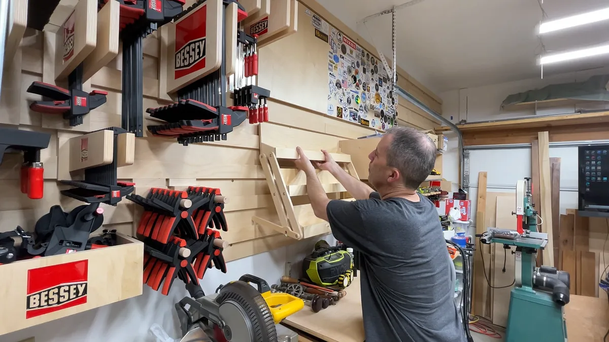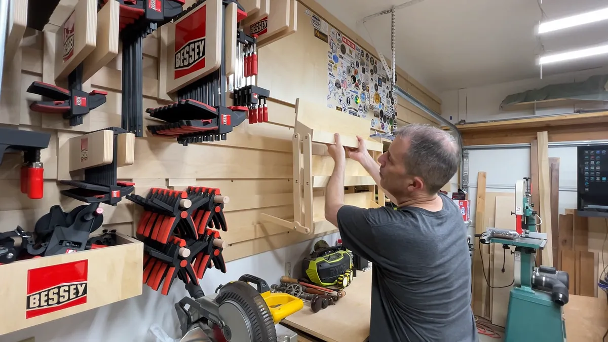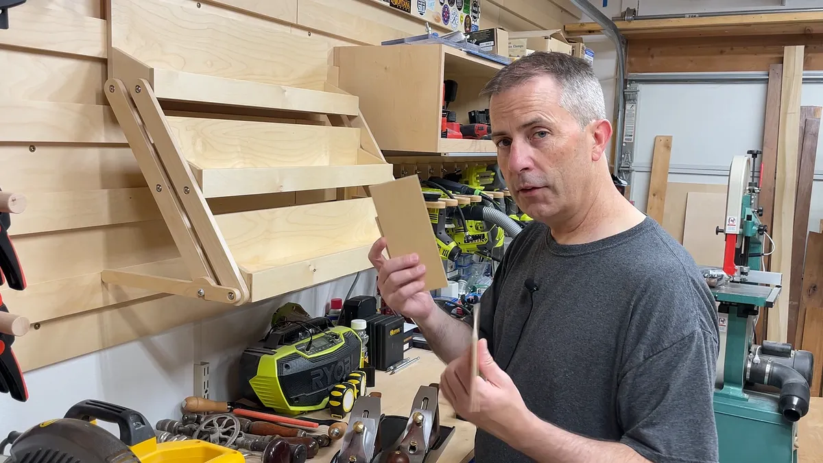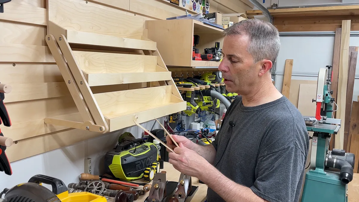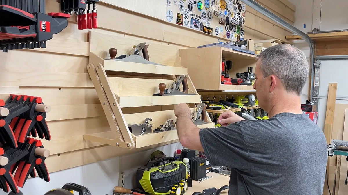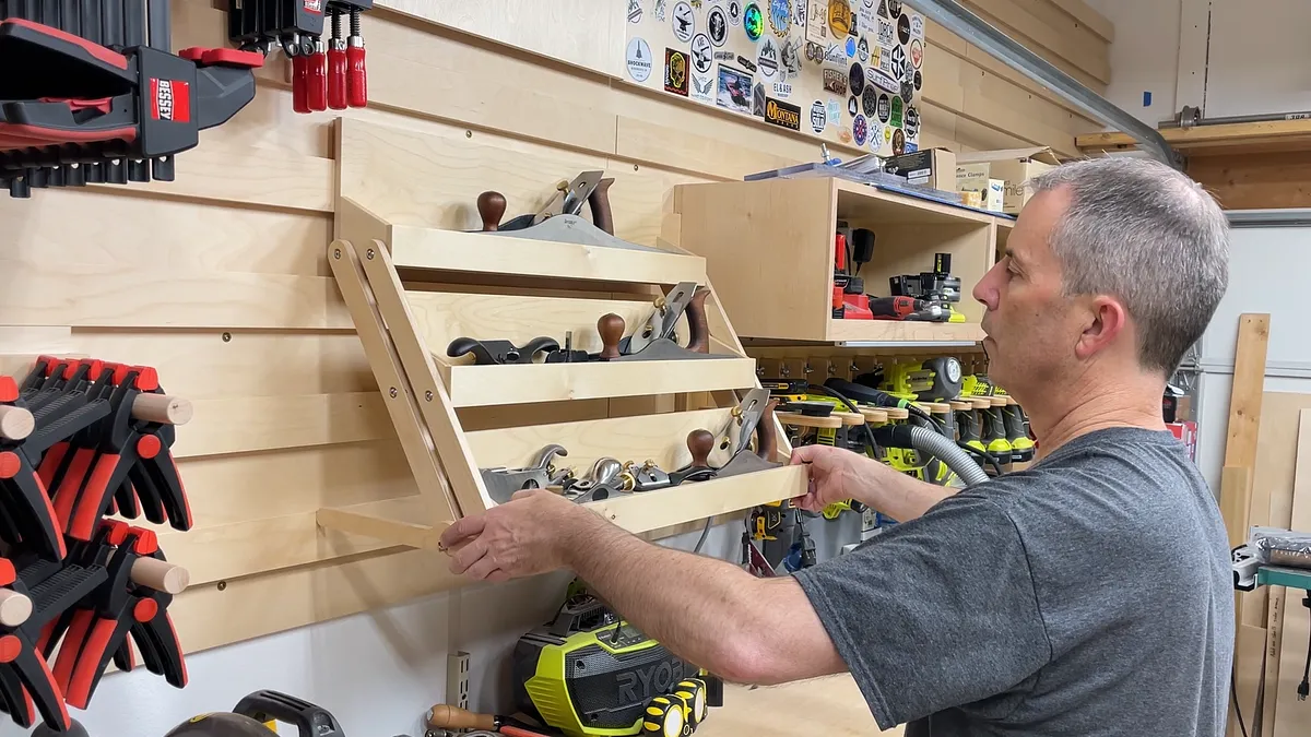 I love how this hand plane holder turned out. I like how I can pull the bottom shelf out and the shelves reorient themselves into a step pattern. This makes it easier to take things off of the bottom two shelves. Then when you are done you can quickly put this back up against the wall and the work area below the shelves is fully accessible.