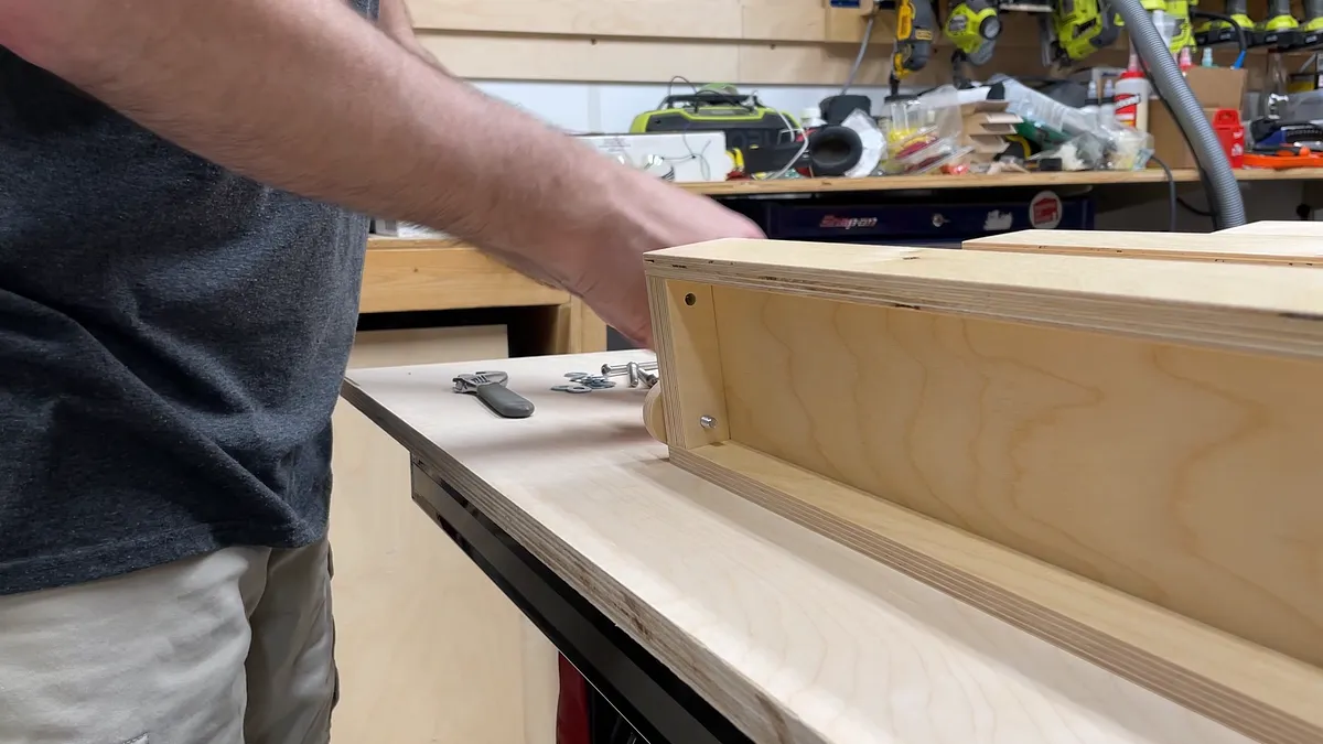 The idea behind this hand plane holder is that the hand planes can rest against the wall when not being used, but the lower two shelves can be pulled out away from the wall so the hand planes are sitting on "stepped" shelves for easier access when using one of more of them for a project.