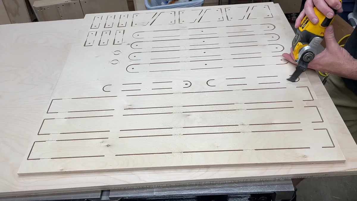 After cutting the shapes on the CNC and before I cut the tabs holding the pieces in place I used an oscillating tools to slice through all of the tabs. I then used a flush trim router bit with guide bearing to remove the remainder of the tabs.