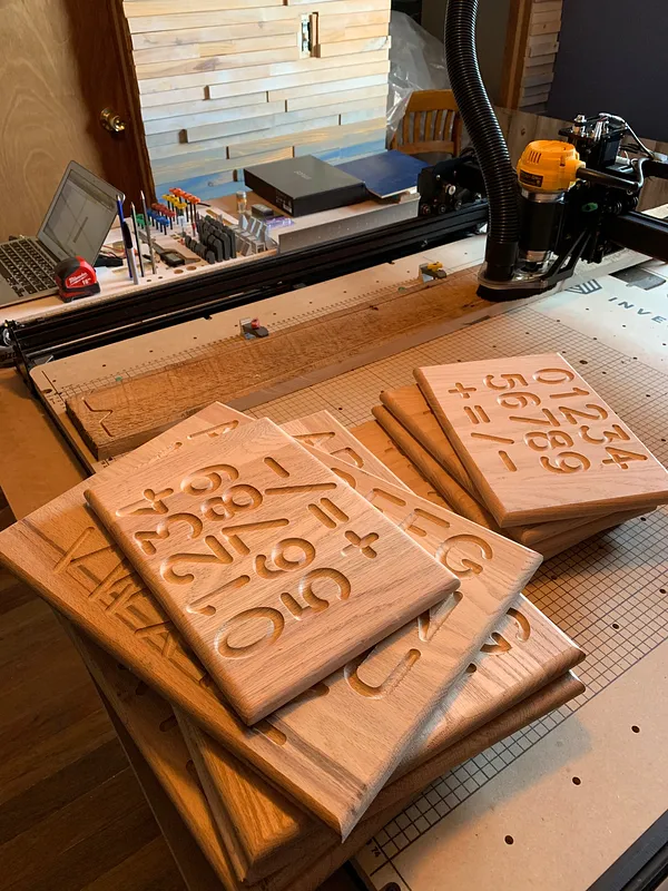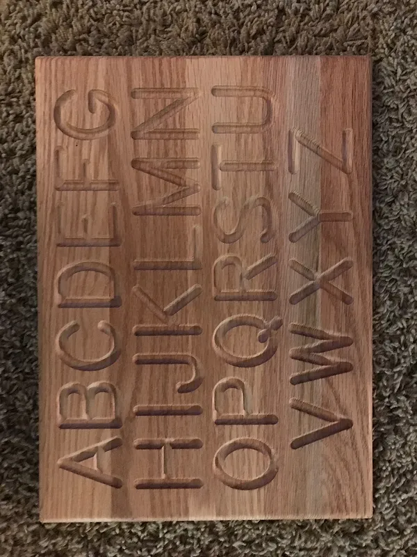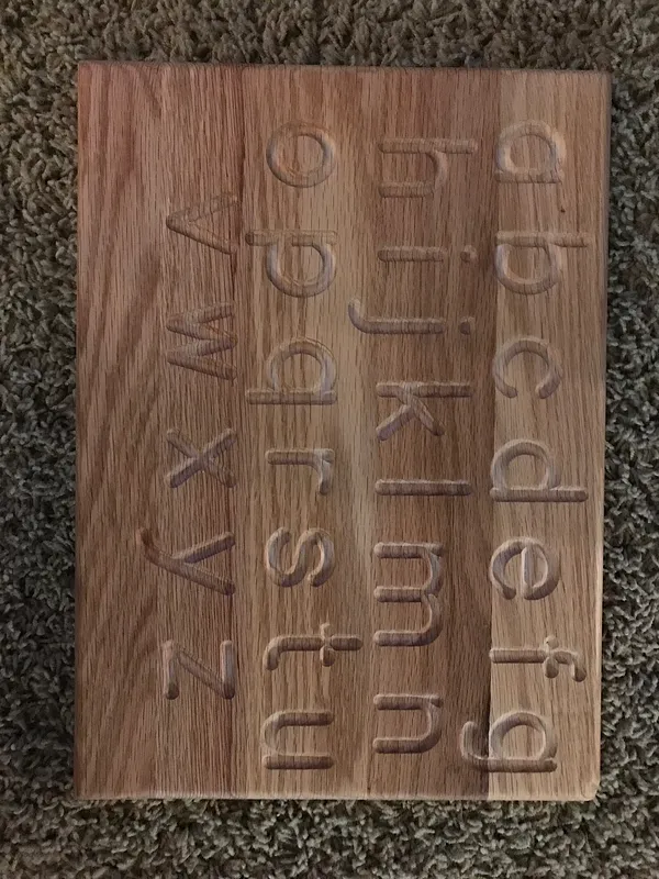 I buy Red Oak stair tread from home improvement center. Can get 3 full board and the cut off piece I cut width wise in half and make specific names on for friends or shapes and numbers for them the practice. This way there is no scrap.