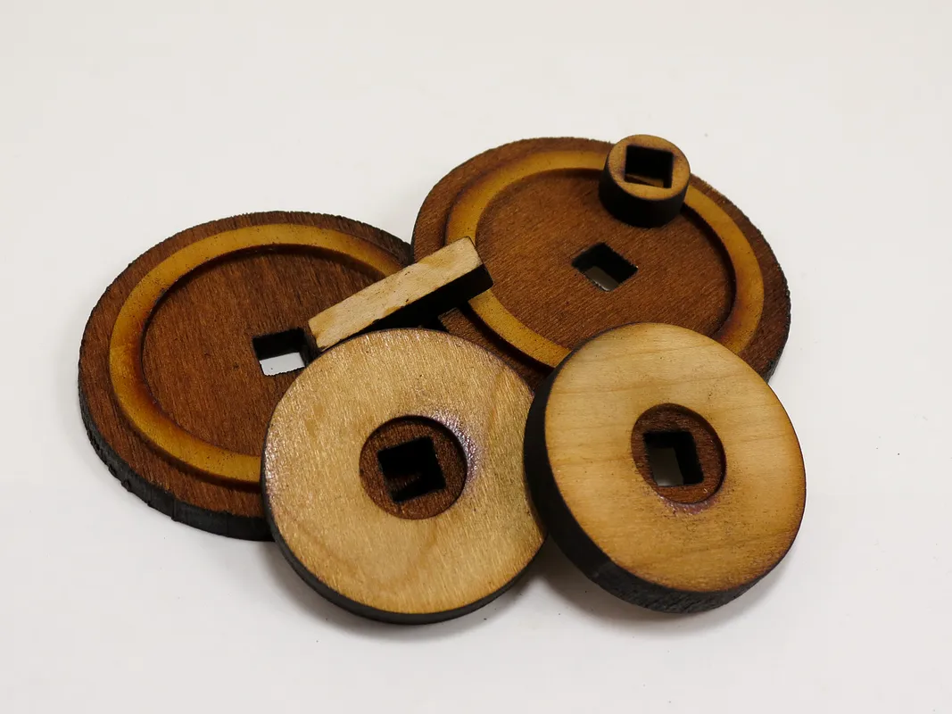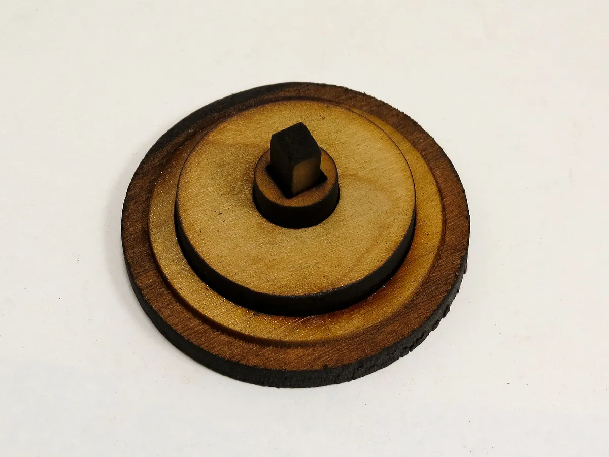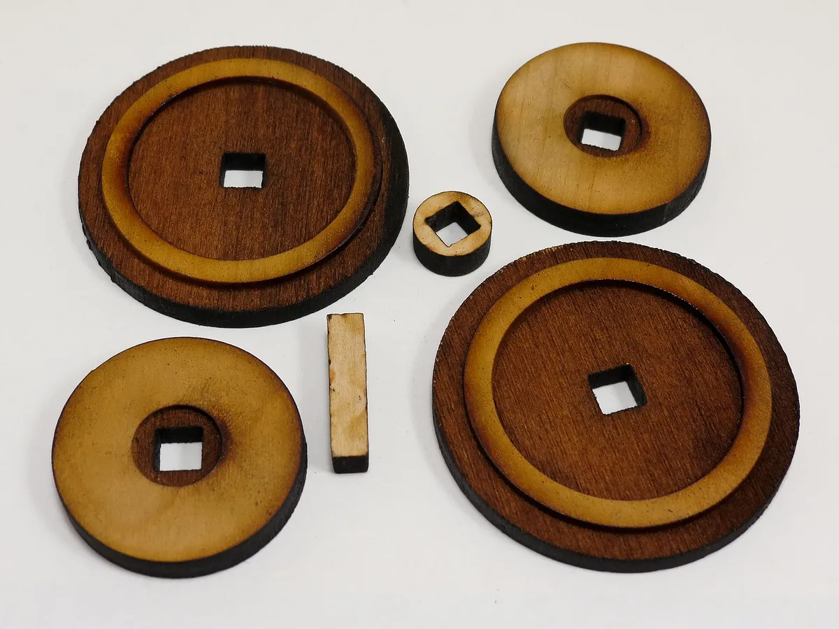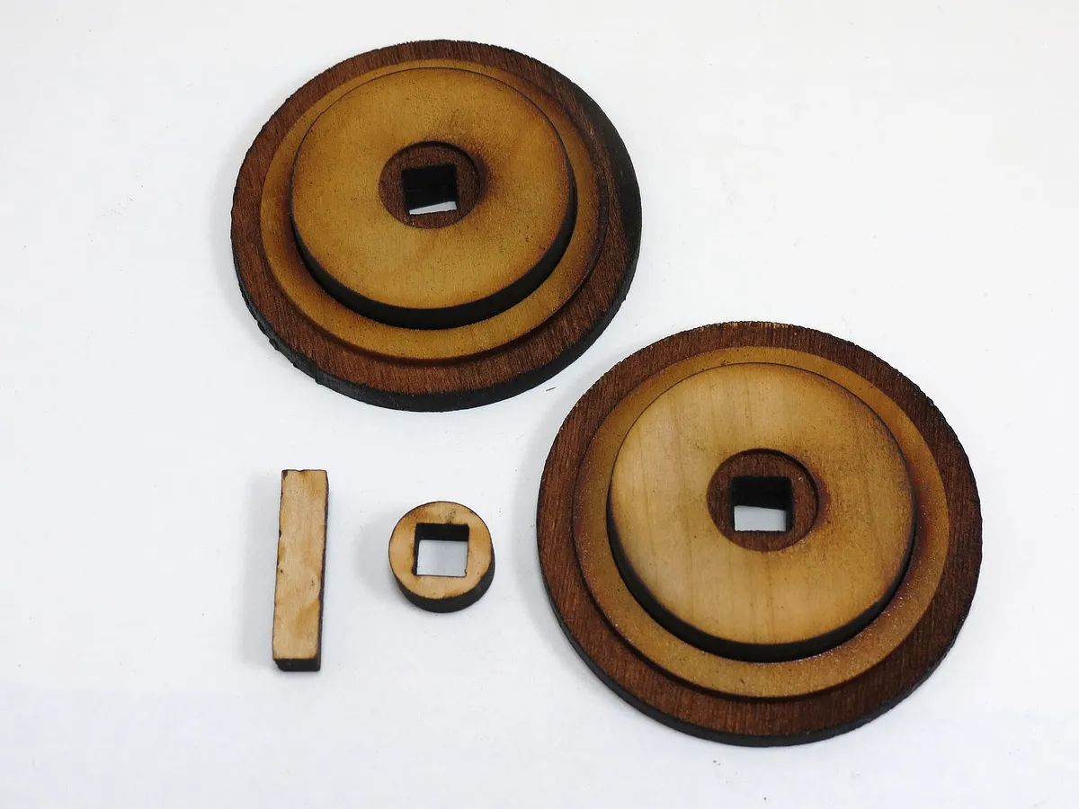 Put a small amount of glue on the axle (the rectangular center piece) & then slide it through the square holes in the center of the discs to align them. Add glue to the center recession in the medium-sized discs, then slide the smallest disc onto the axle.
