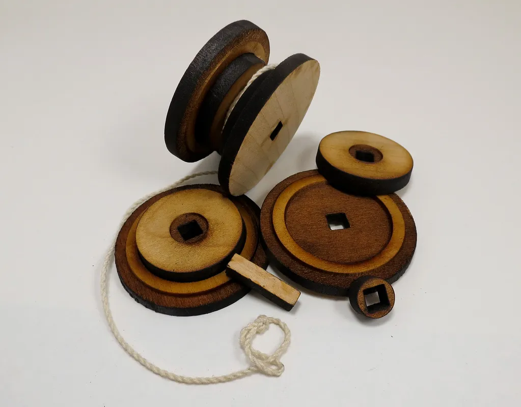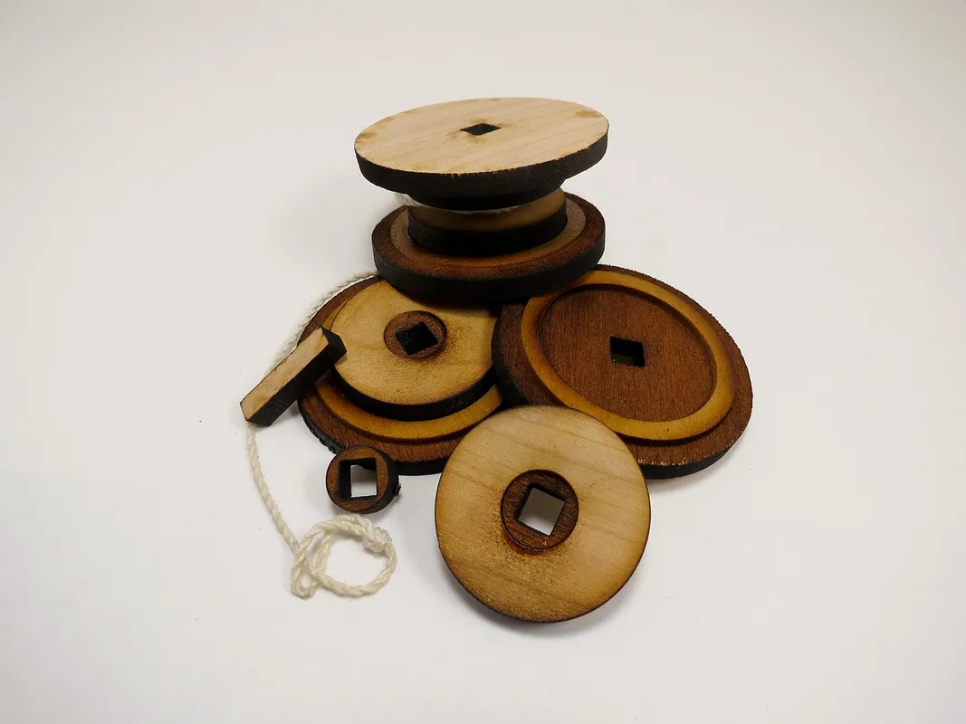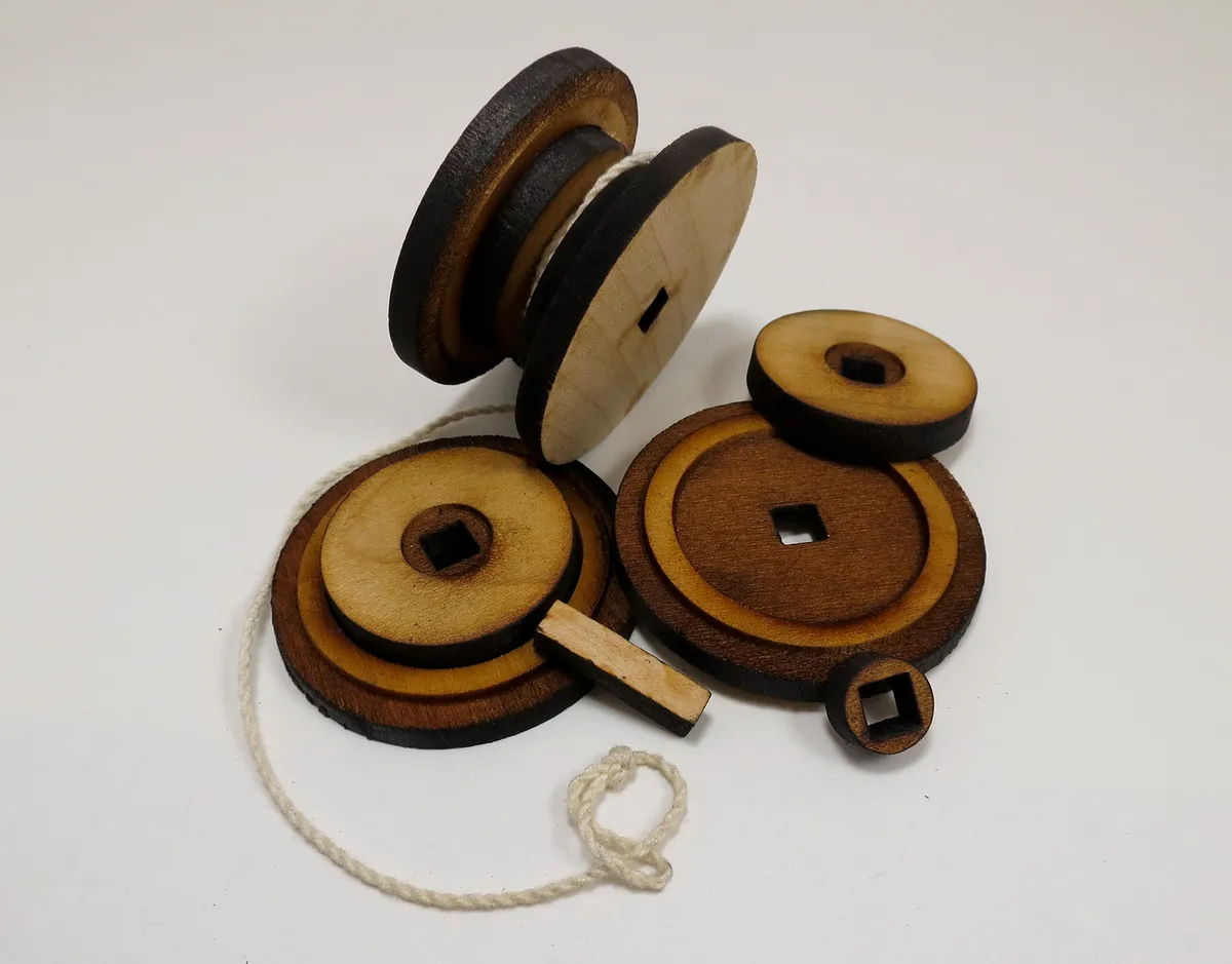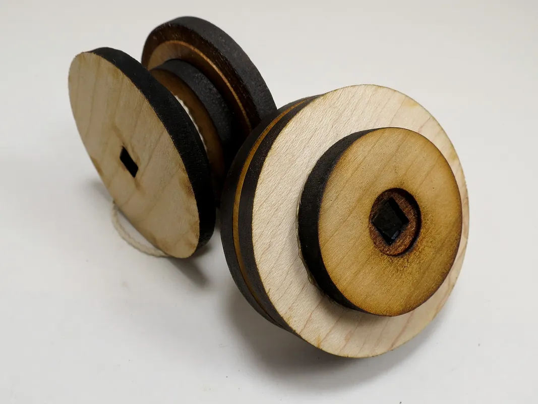 Put a small amount of glue on the axle (the rectangular center piece) & then slide it through the square holes in the center of the discs to align them. Add glue to the center recession in the medium-sized discs, then slide the smallest disc onto the axle.