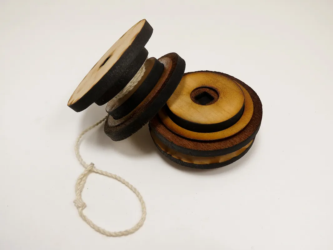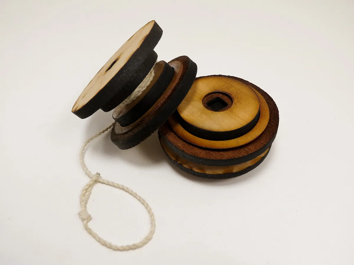 After the glue has dried, slip on a cotton yo-yo string (beeswax on the string loop optional) & have fun! You can also assemble this model inside-out for a classic "looper" shape.