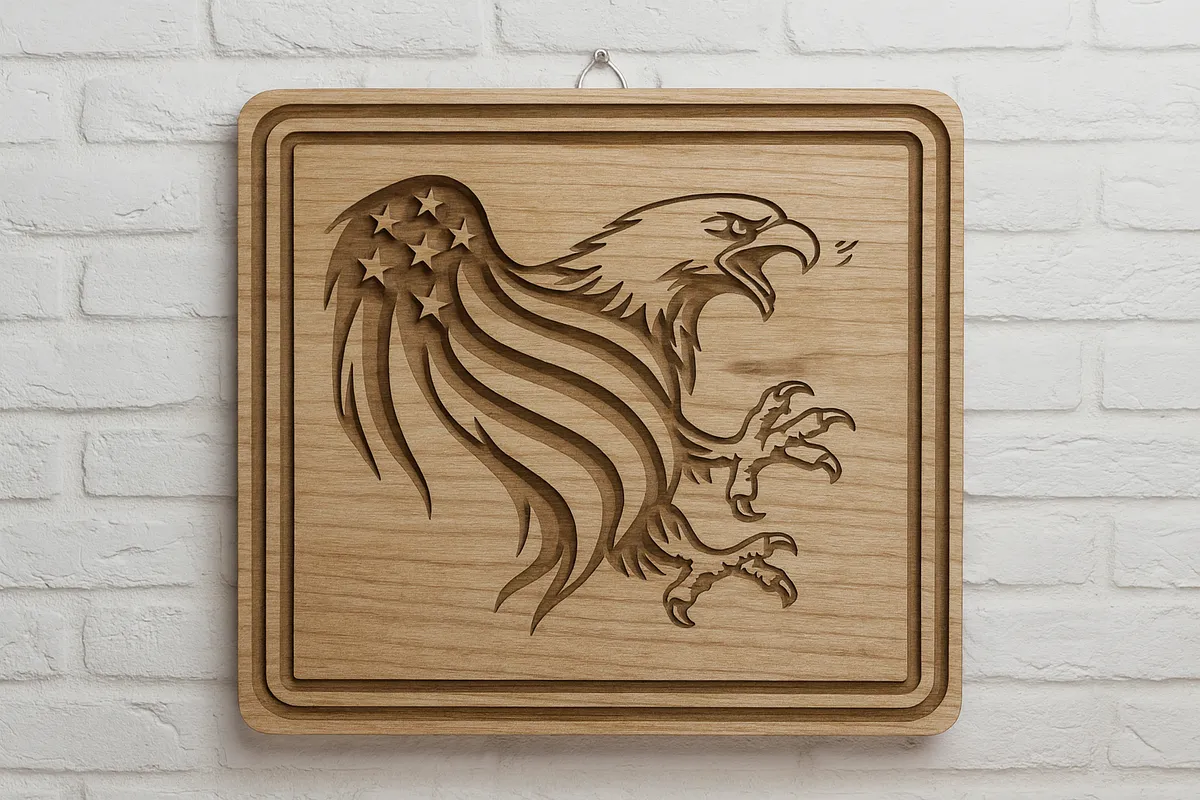 Crafted from cherry plywood, this features a stylized bold American eagle design. The stylized feathers flow into stripes accented with stars, symbolizing strength and patriotism. Perfect as wall art for your favorite patriot.