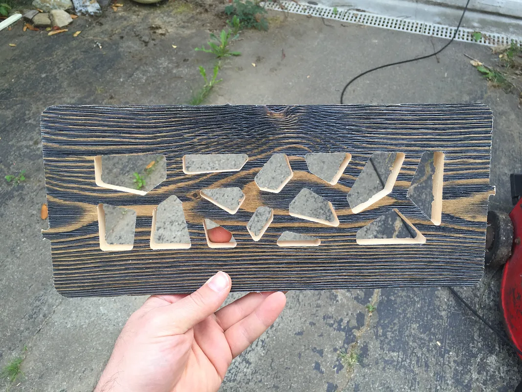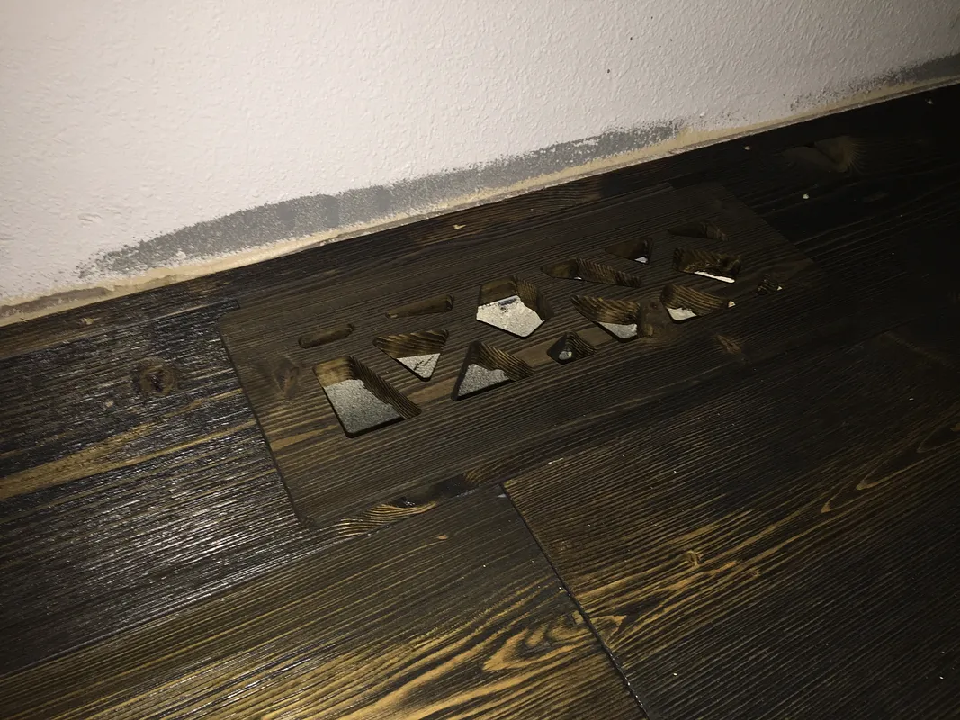 This project carves heating register covers out of 7" width hardwood flooring. The flooring is pre-finished, so it was carved from the bottom, with a clean piece of scrap wood below to minimize tear-out. The edges were stained to match the pre-finished top.