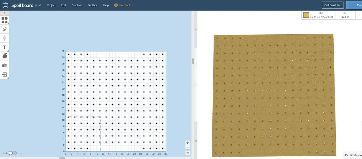 This Spoil Board is set at 32" x 32". Holes are offset 31" x 31" and the grid is 30" x 30" with numbers up the Y every 2" and across the X every 2"