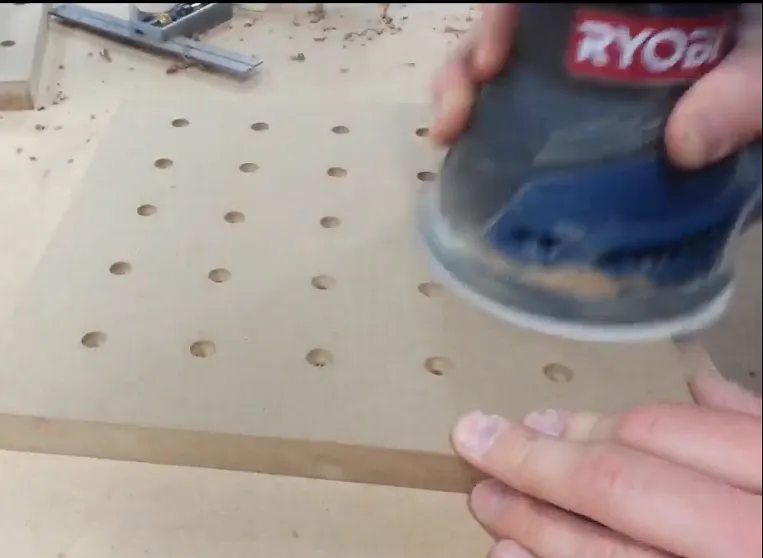Flip the wasteboard to the underside and use a countersink bit to countersink all the drilled holes, this will allow for the threaded inserts to sit flush or below the surface of the MDF.