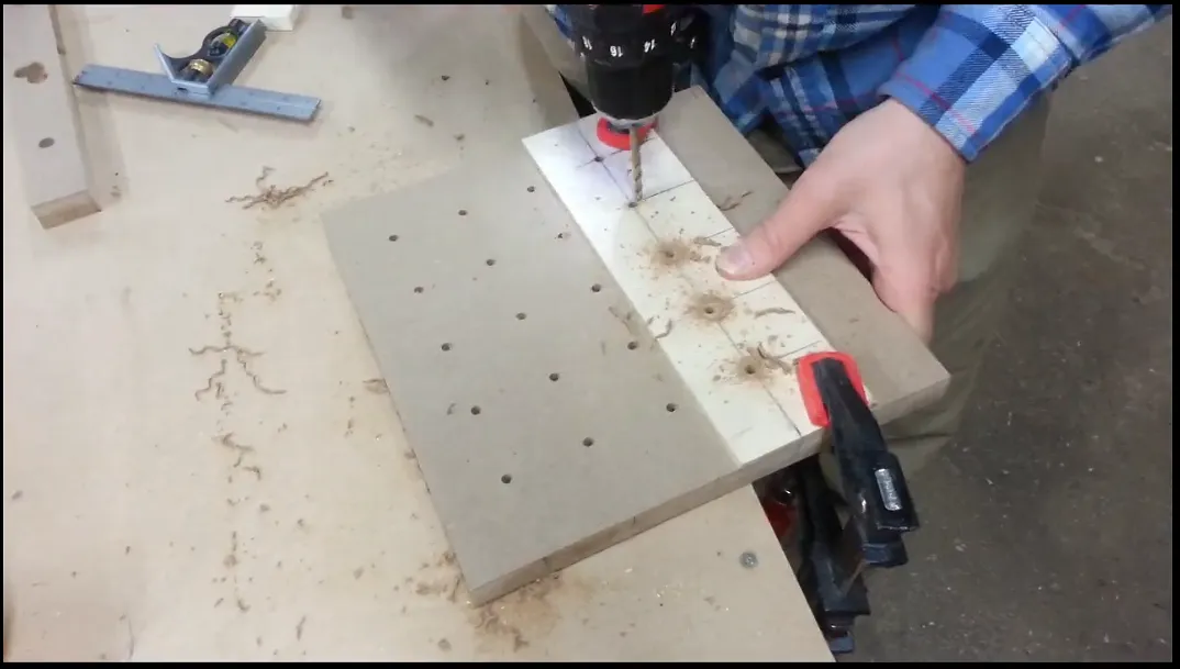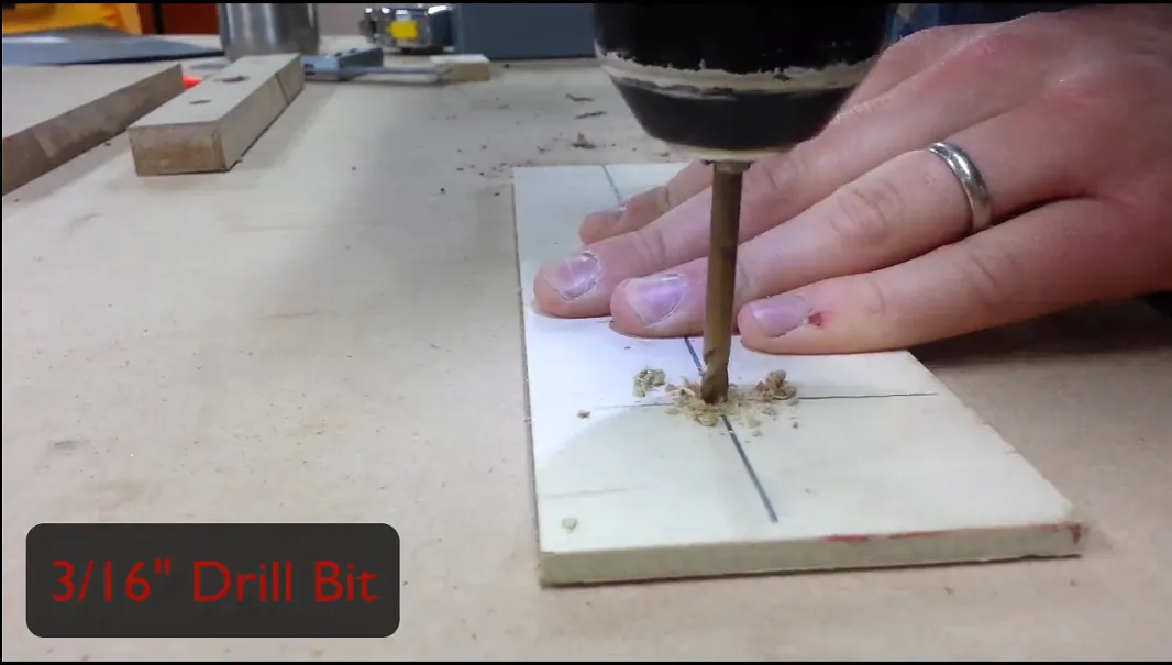 Draw a centerline through the entire drill template intersecting with the lines drawn on the spacerblock.