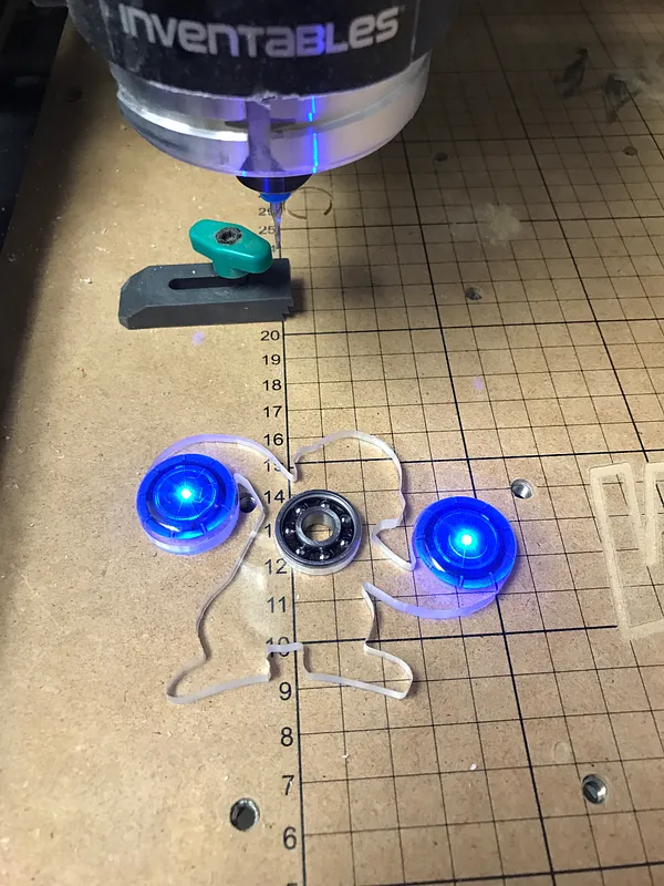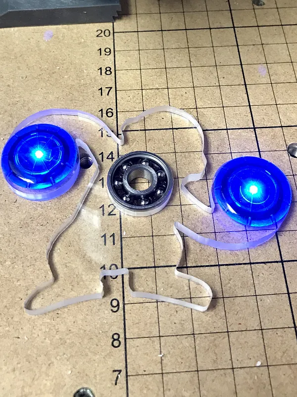 Spinner I made with cast acrylic, 1 bearing, and 2 LEDs. You'll have to resize the bearing holes on the arms if you decide to put bearings there instead
