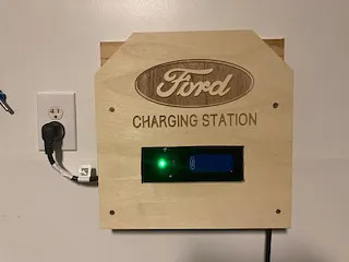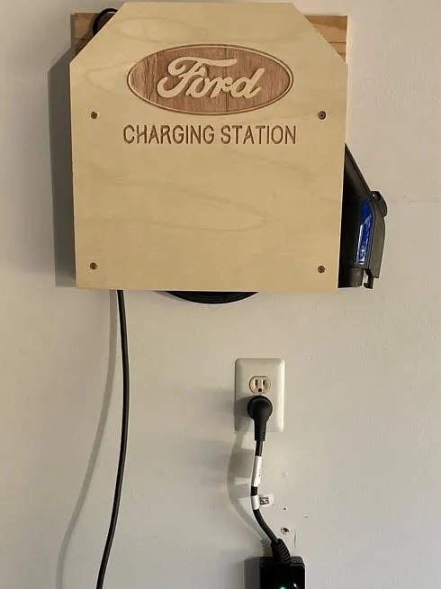 Thanks to Troy Boersch for his beautiful ford sign project. This project holds the charging cable for my Ford plug in Hybrid. Not too bad for an afternoon and a few scraps of plyboard. Will think about painting it, but it looks pretty good as is..