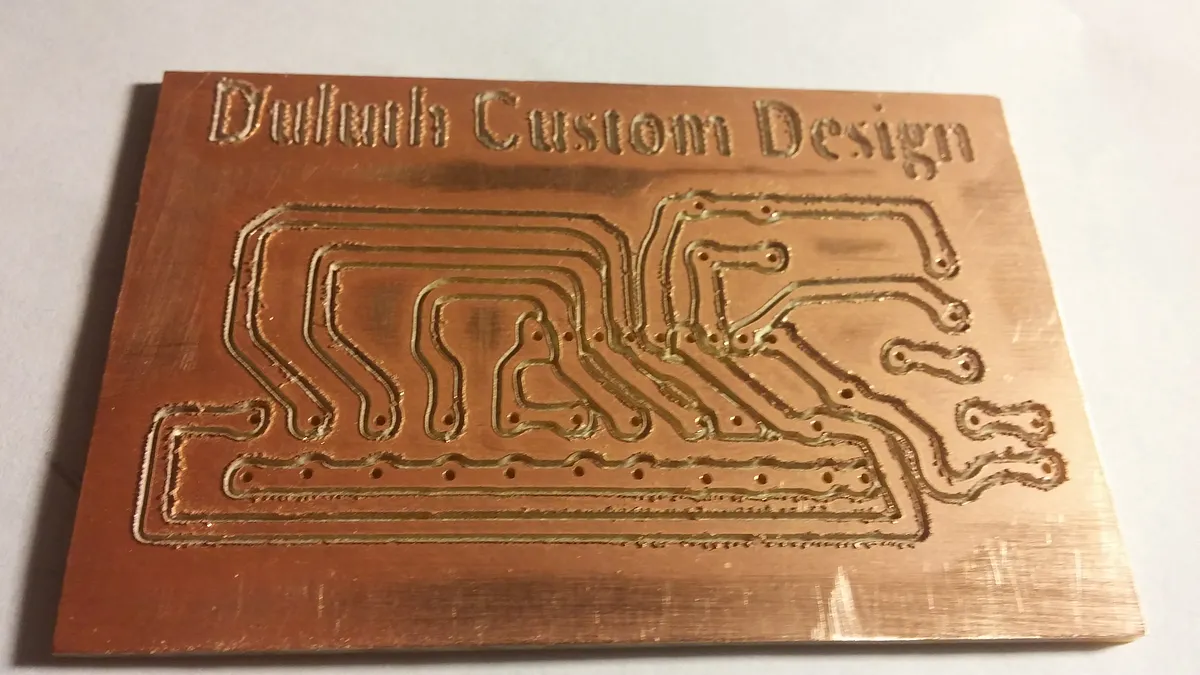 Secure circuit board blank onto X-Carve. Use a small v bit to carve the paths. Set z - axis to .014 inch set speed to 15 in/min CARVE! Takes 9 min to carve paths
